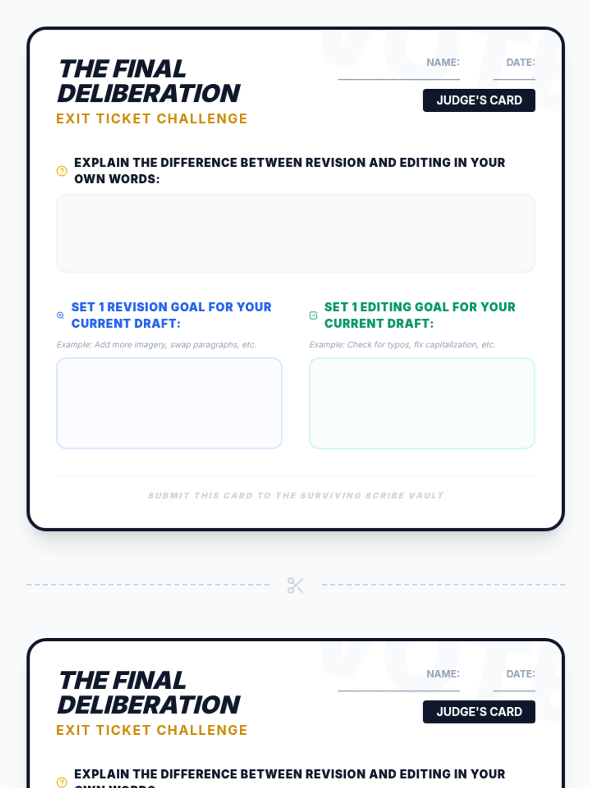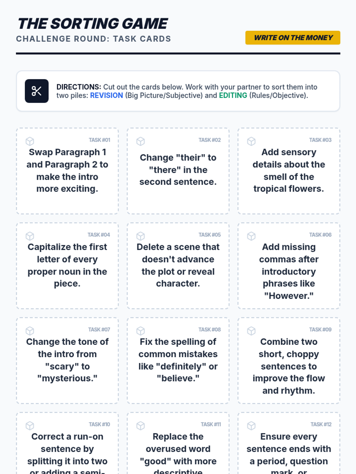 A high-stakes, reality TV-themed lesson where students compete to understand the difference between 'Big Picture' revision and 'Detail-oriented' editing. Based on the 'Write on the Money' workshop video, students will sort tasks and set goals for their own writing.