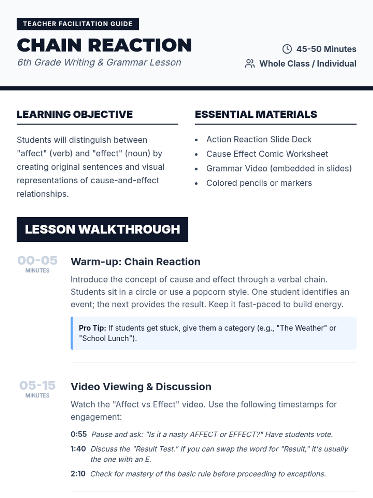 An intermediate ESL/ELL lesson focused on distinguishing between 'affect' and 'effect' using word forms, context clues, and a visual mnemonic. Includes a video-based discussion, a kinesthetic card-sorting activity, and a visual anchor chart.