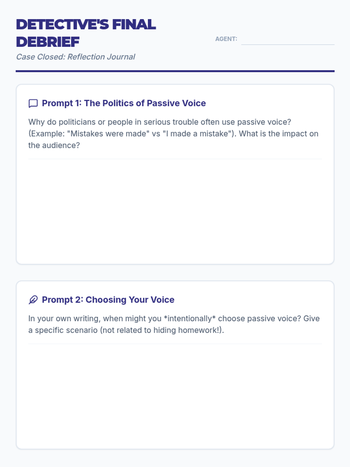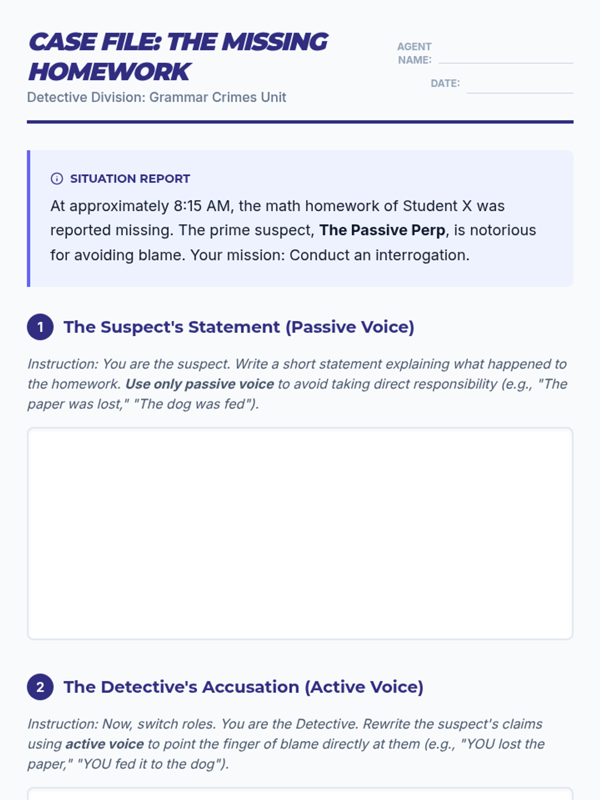 Students investigate the strategic use of passive voice to hide responsibility or emphasize results through a 'Mystery of the Missing Homework' role-play activity and video analysis.