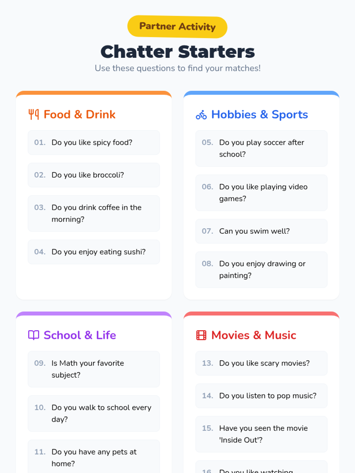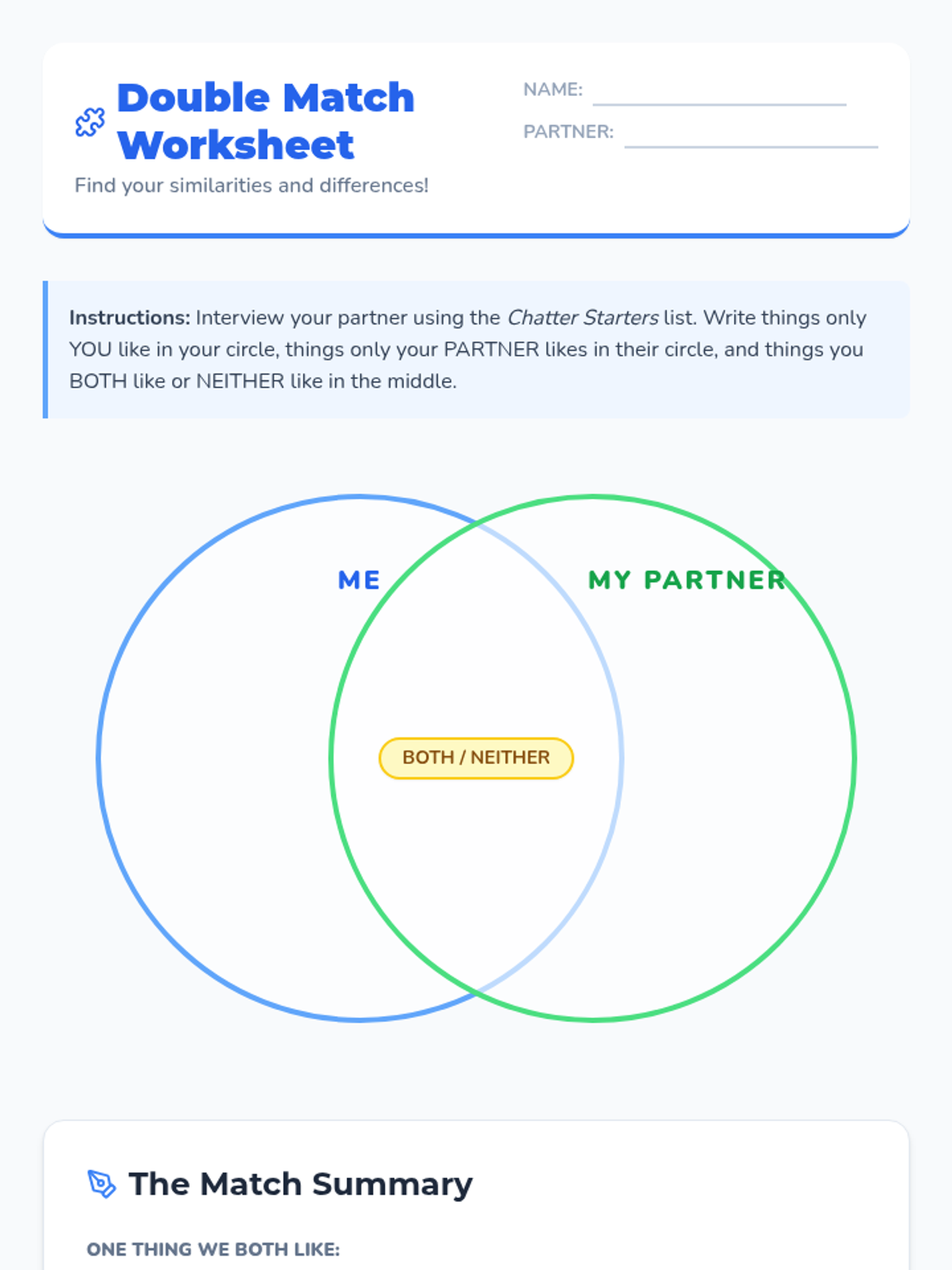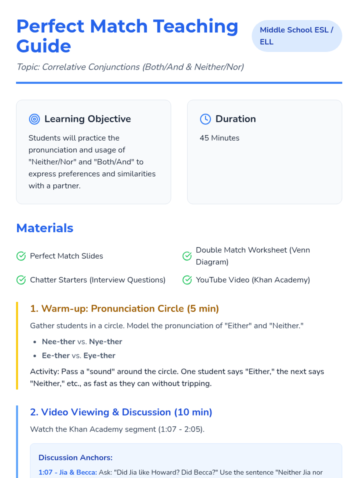 A lesson for Middle School ESL/ELL students to master 'Both/And' and 'Neither/Nor' using a 'matching' theme and interactive interviews.