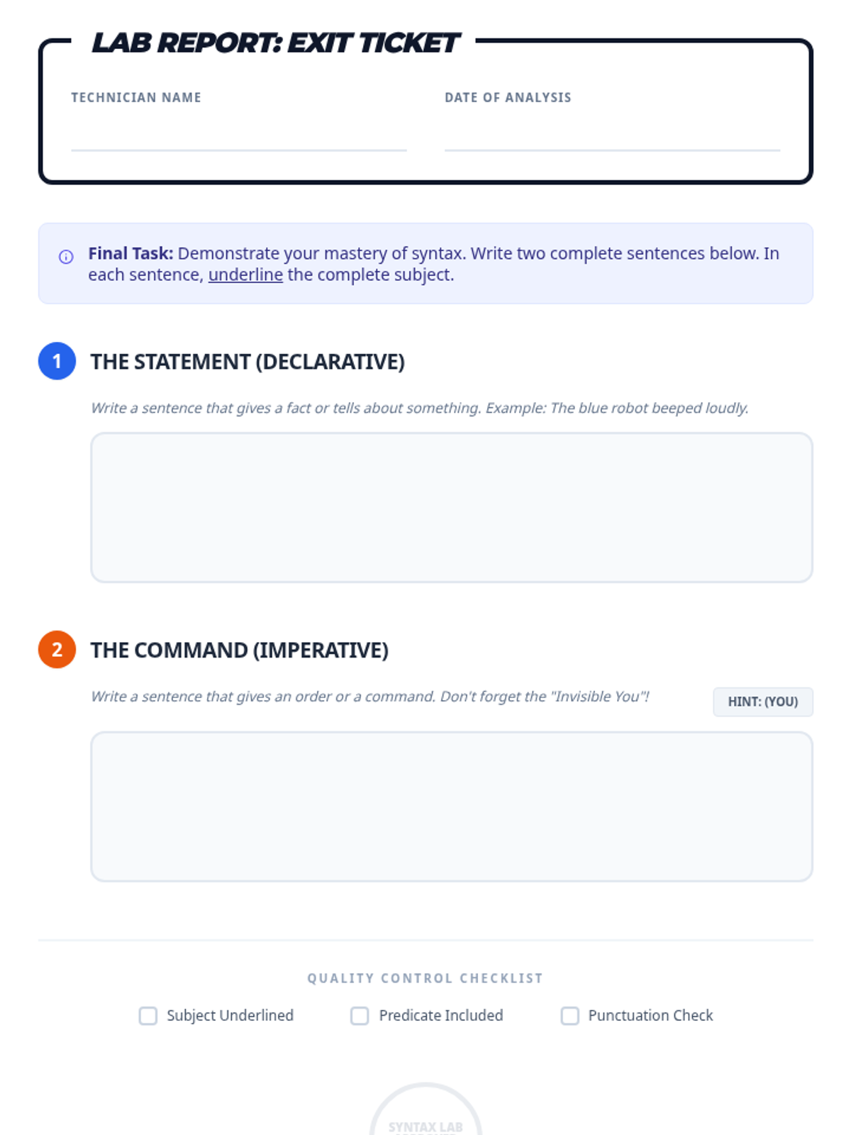 A high-energy grammar review game where students act as 'Syntax Technicians' to fix glitches in a virtual world. This lesson focuses on mastering commas, sentence errors, capitalization, and verb tense through collaborative task card challenges.