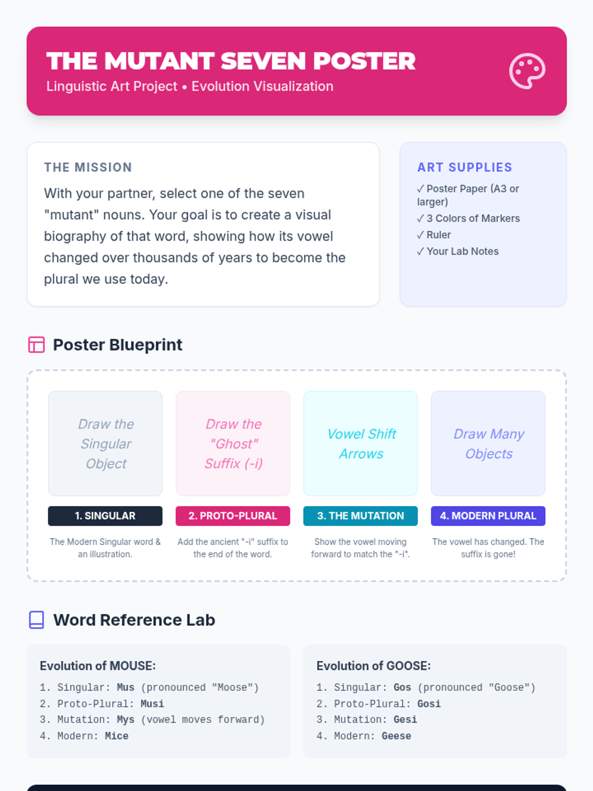 A lesson exploring the evolution of English 'mutant plurals' through the lens of historical linguistics and vowel harmony, featuring a Khan Academy video and a creative poster project.