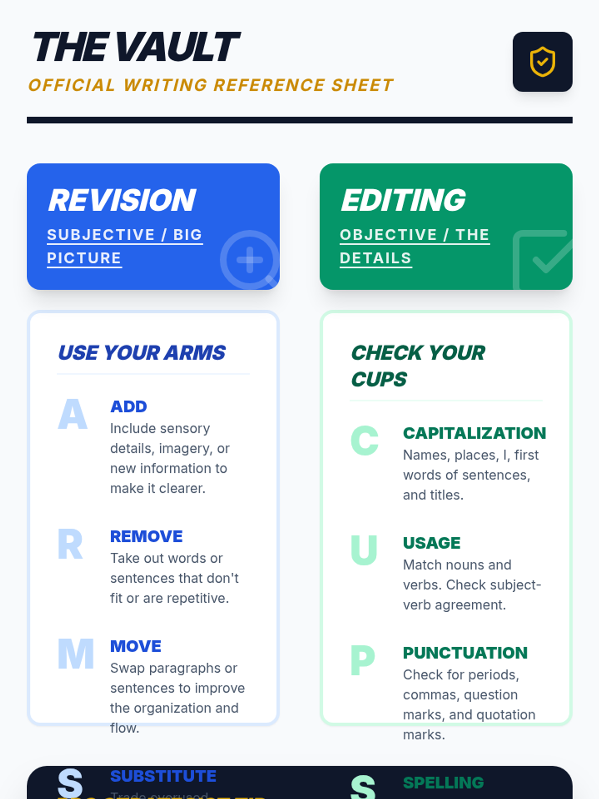 A comprehensive lesson for 5th-6th grade students to master the difference between subjective revision (style) and objective editing (mechanics) using the ARMS and CUPS strategies.