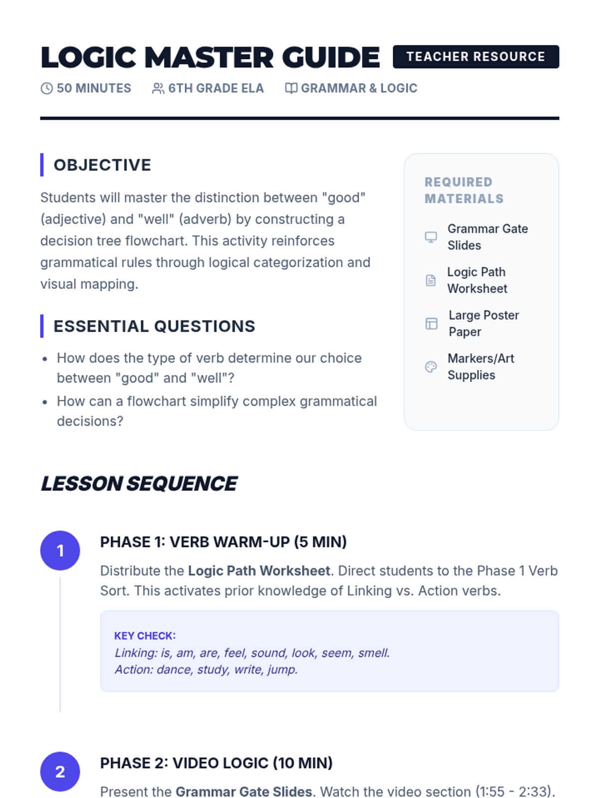A lesson where 6th-grade students master the difference between 'good' and 'well' by creating visual decision tree flowcharts based on verb types.
