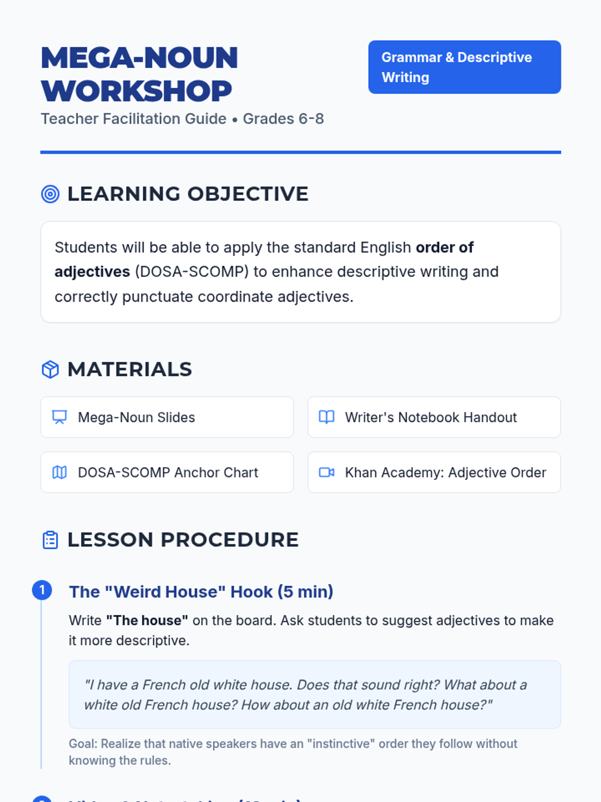 A middle school grammar lesson focusing on the natural order of adjectives in English using the DOSA-SCOMP mnemonic. Students learn to build complex, descriptive 'Mega-Nouns' for monsters or futuristic vehicles.