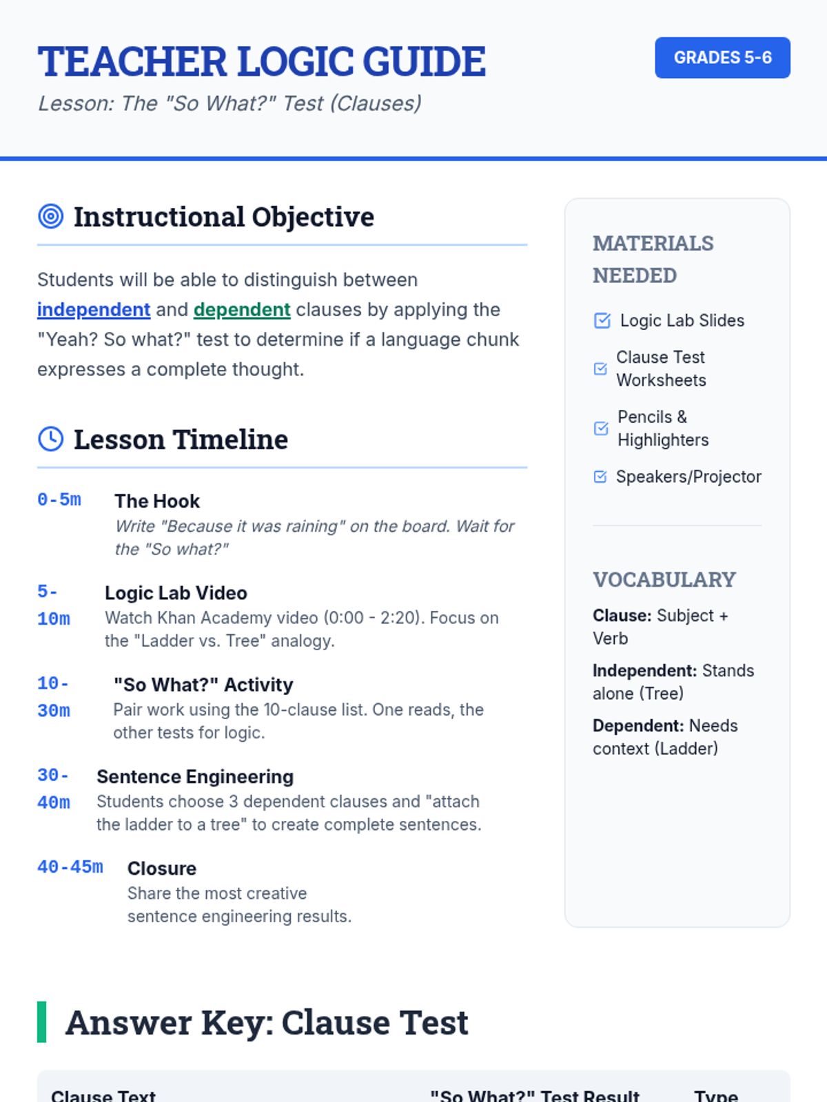 A lesson focused on distinguishing between independent and dependent clauses using the "So What?" test, featuring the tree and ladder analogy.