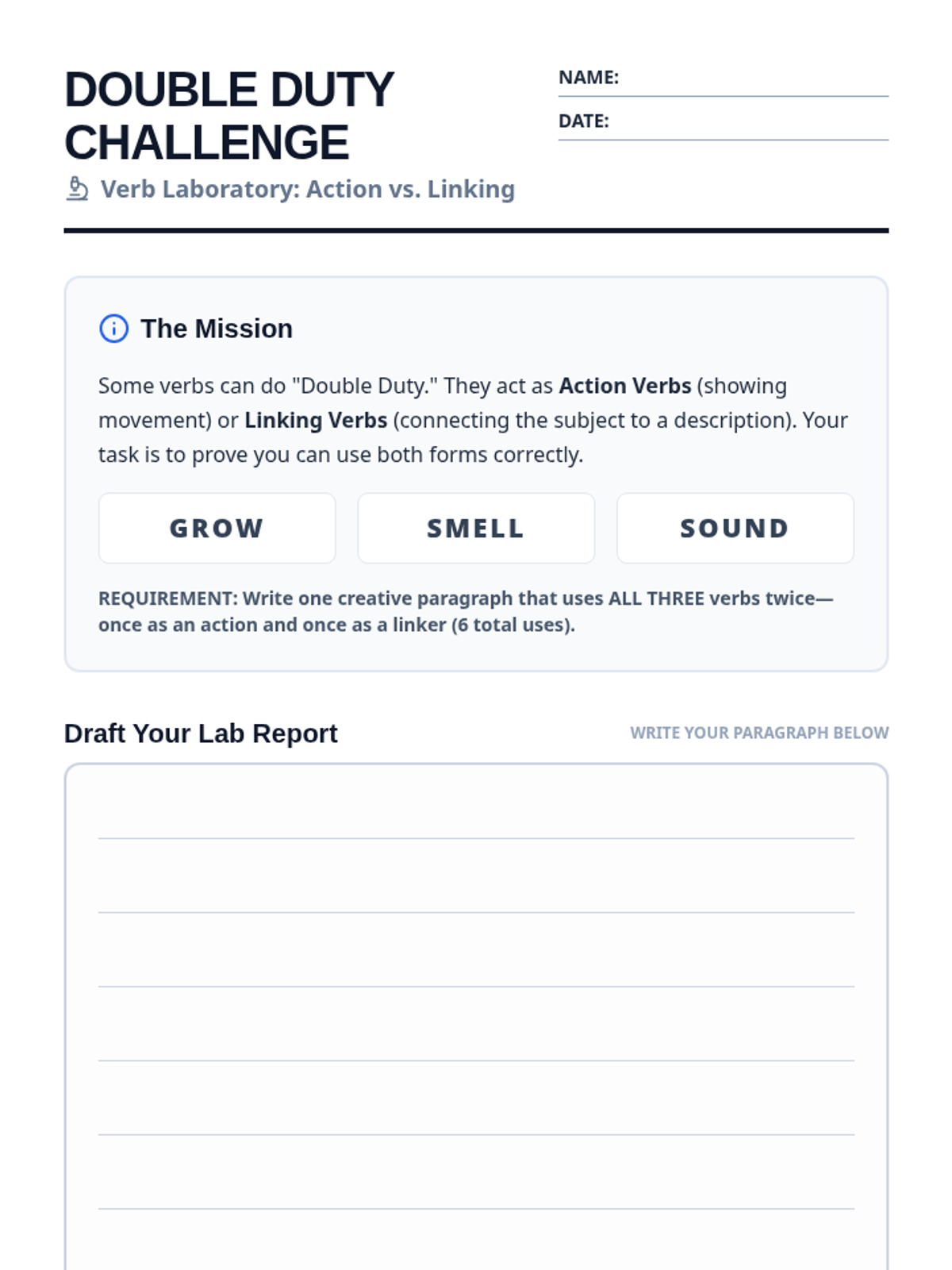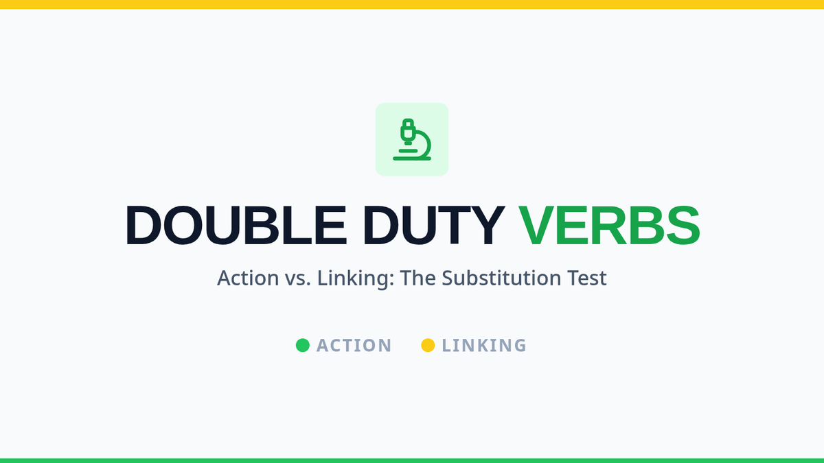 Students investigate the dual nature of verbs like 'grow', 'smell', and 'sound' by writing a creative paragraph that uses each as both an action and a linking verb. The lesson features a video-guided substitution test and a peer-review highlighting activity.