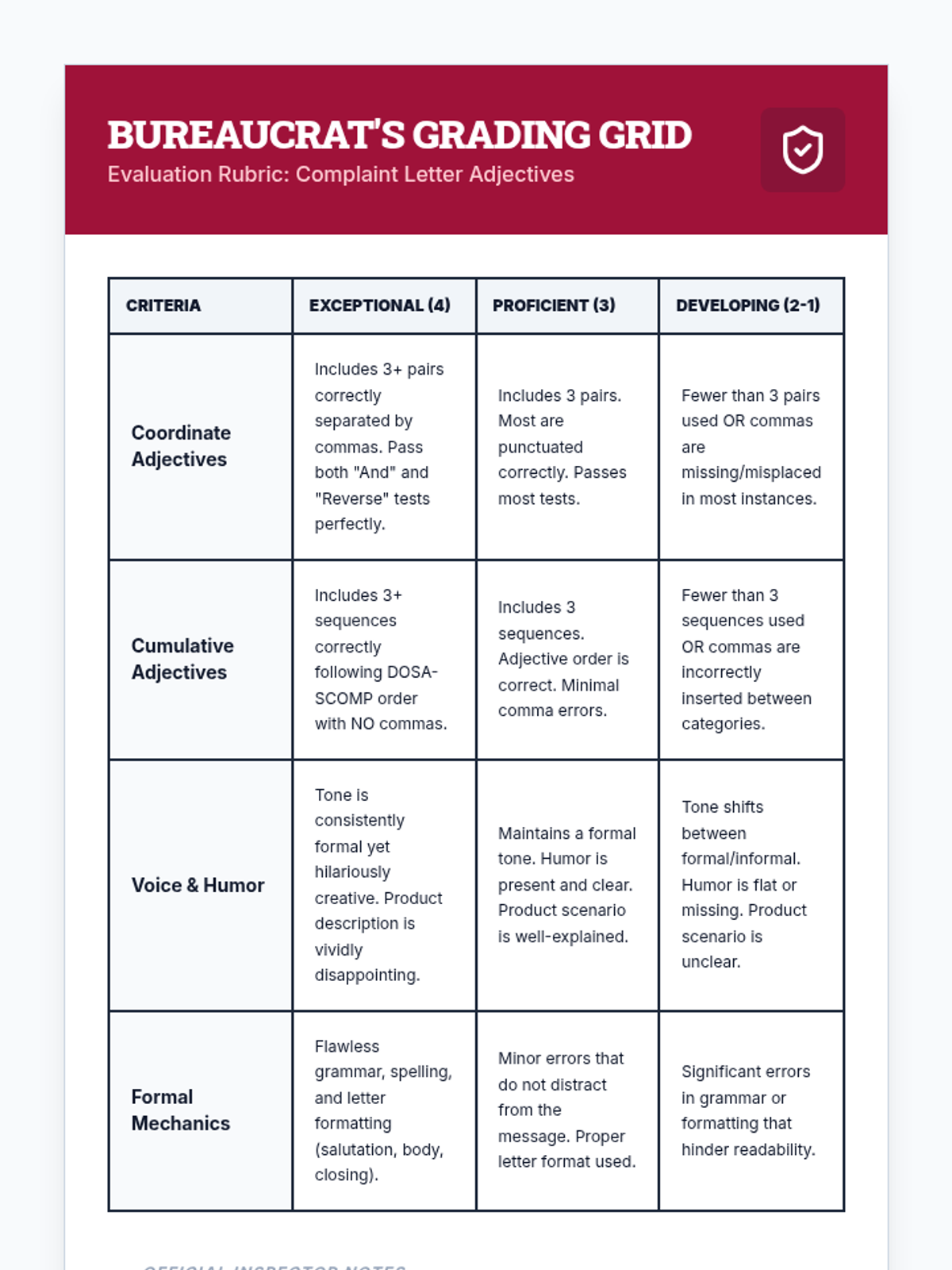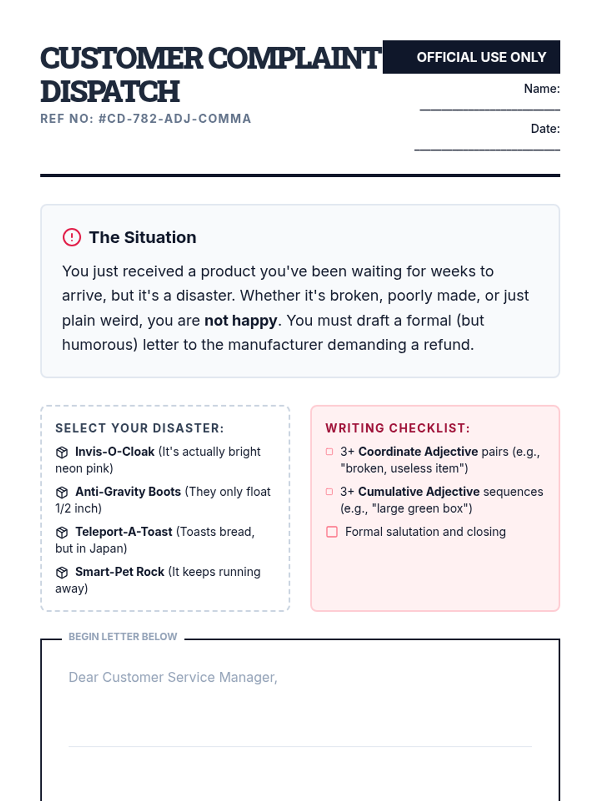 Students learn the difference between coordinate and cumulative adjectives using the DOSA-SCOMP hierarchy, applying their knowledge to write a humorous complaint letter about a defective fictional product.