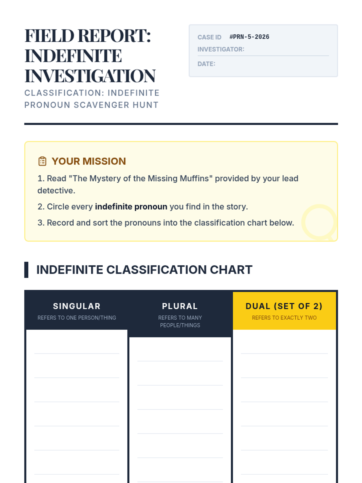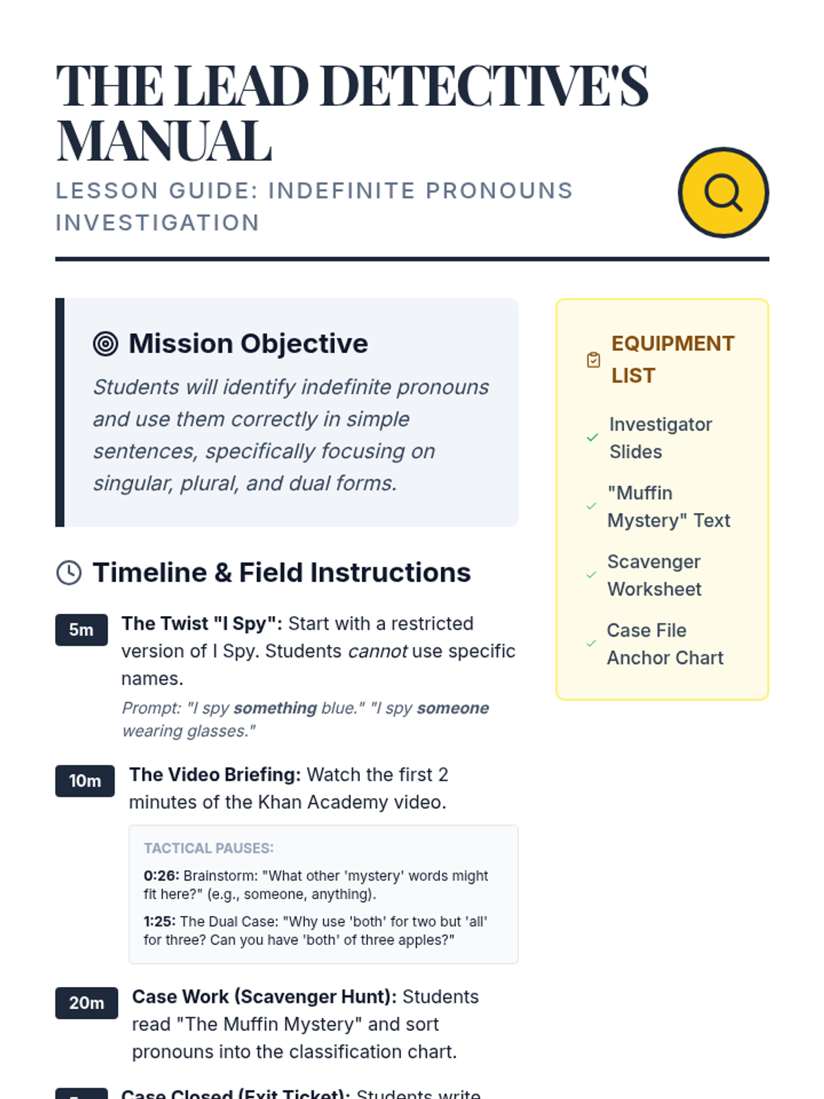 Students will transition from simple descriptive sentences to evocative 'show, don't tell' writing by mastering the difference between concrete and abstract nouns. Using a detective theme, they will describe emotions and ideas using only sensory evidence.
