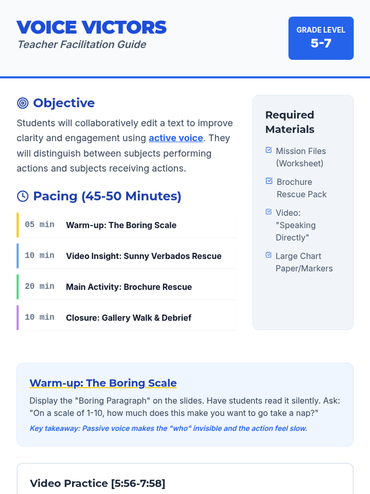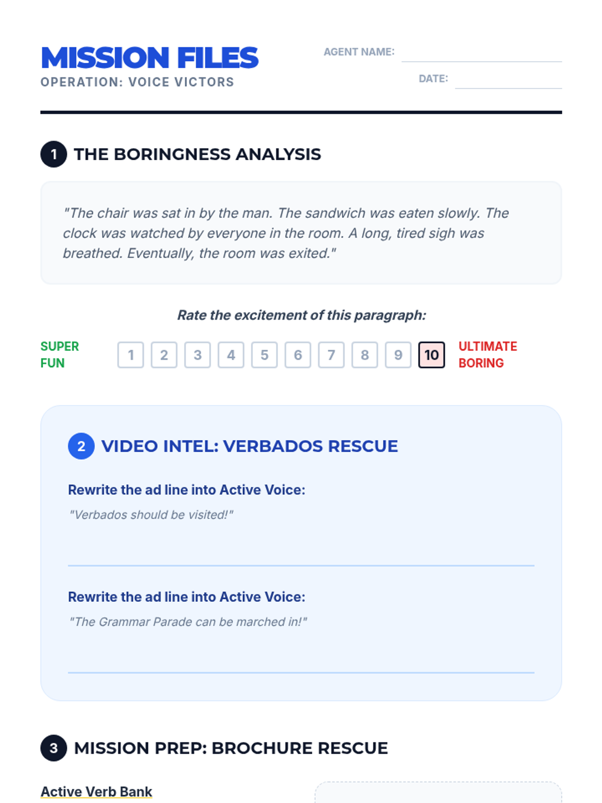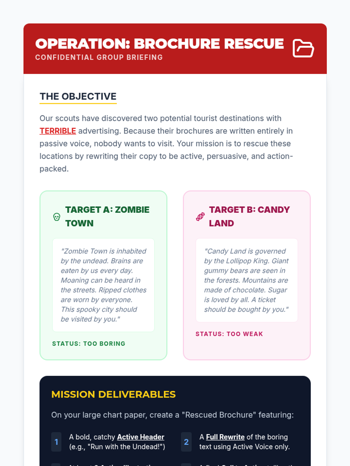 A high-energy lesson where students transform dull, passive descriptions into exciting, active narratives to help save a fictional tourism board. Includes video analysis and a collaborative editing project.