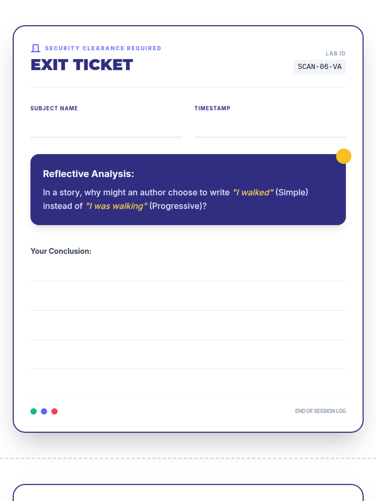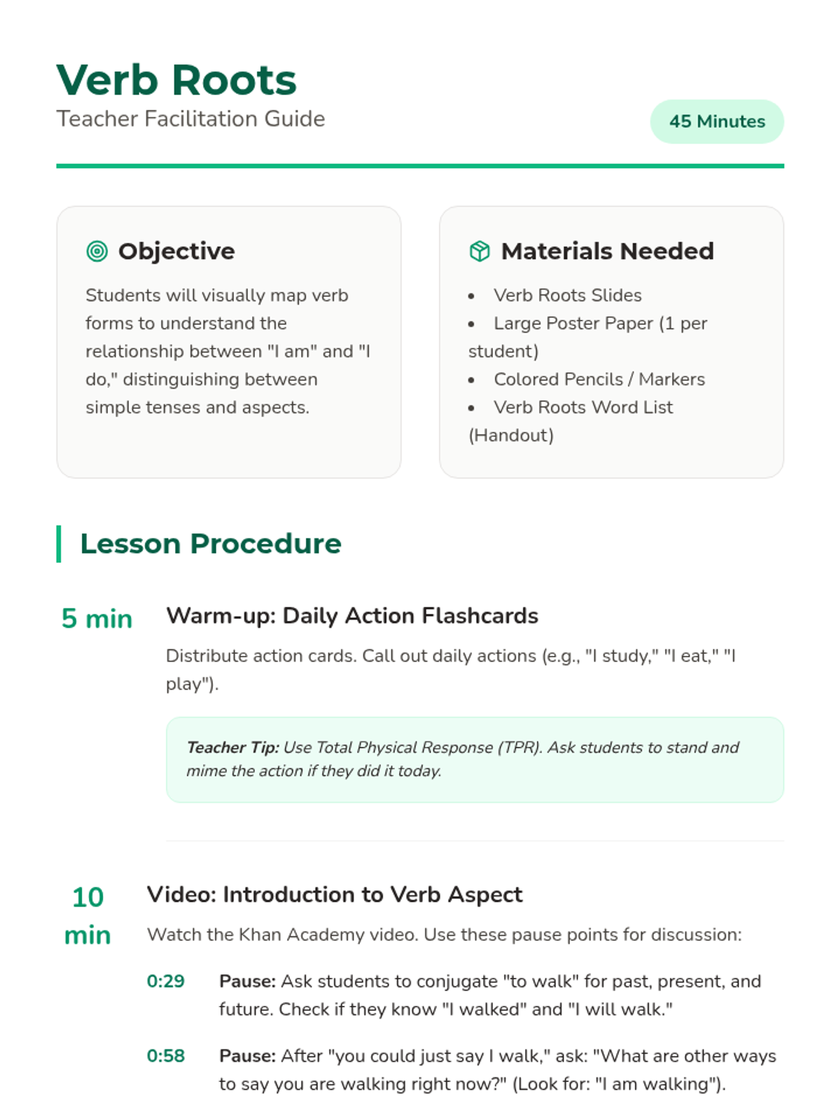 Students will learn to distinguish between the Simple Aspect and Progressive Aspect in English grammar, focusing on the concept of 'bare tense' and the role of helper verbs. The lesson includes a video analysis, a hands-on sorting activity, and a reflective exit ticket.