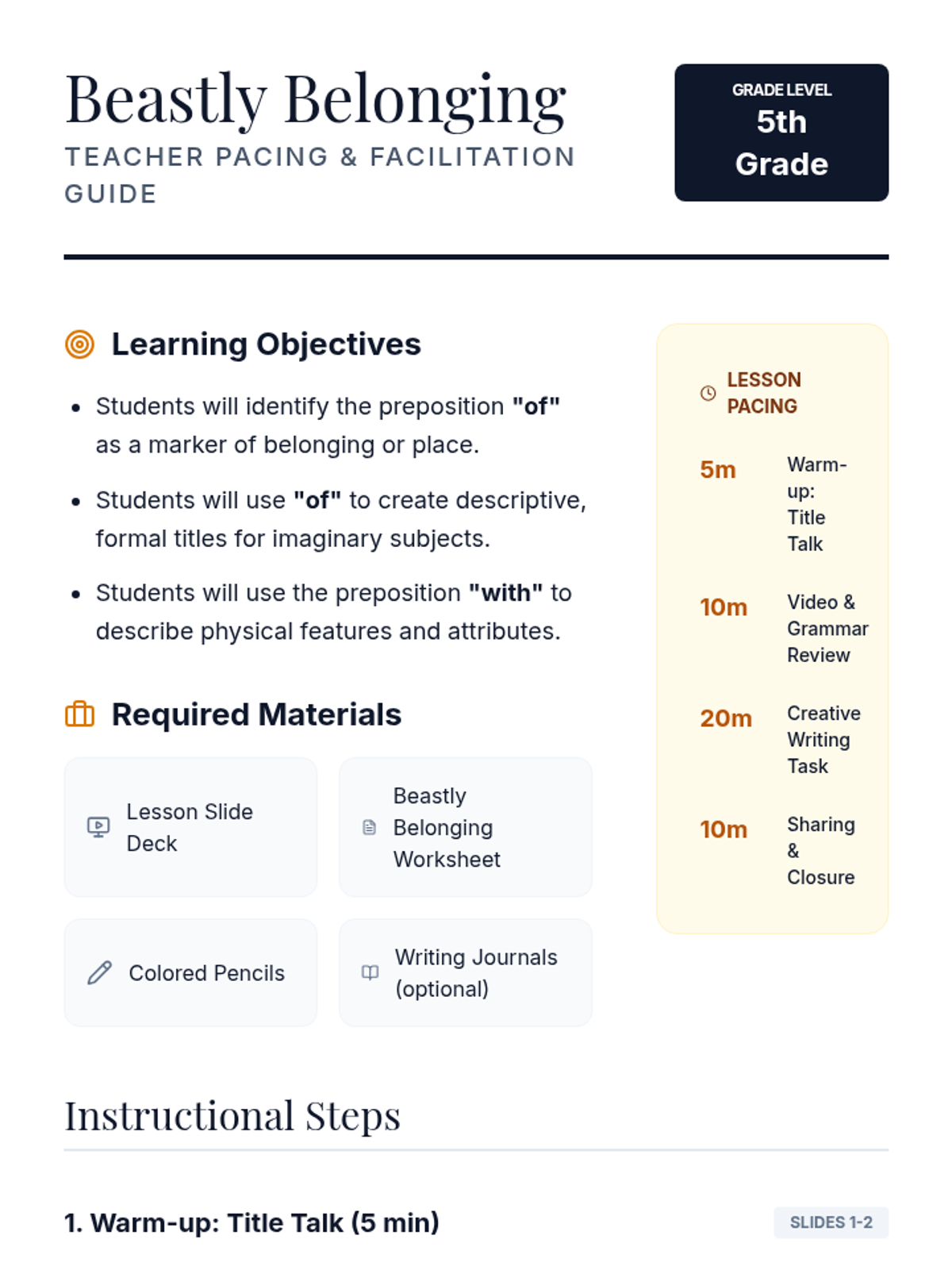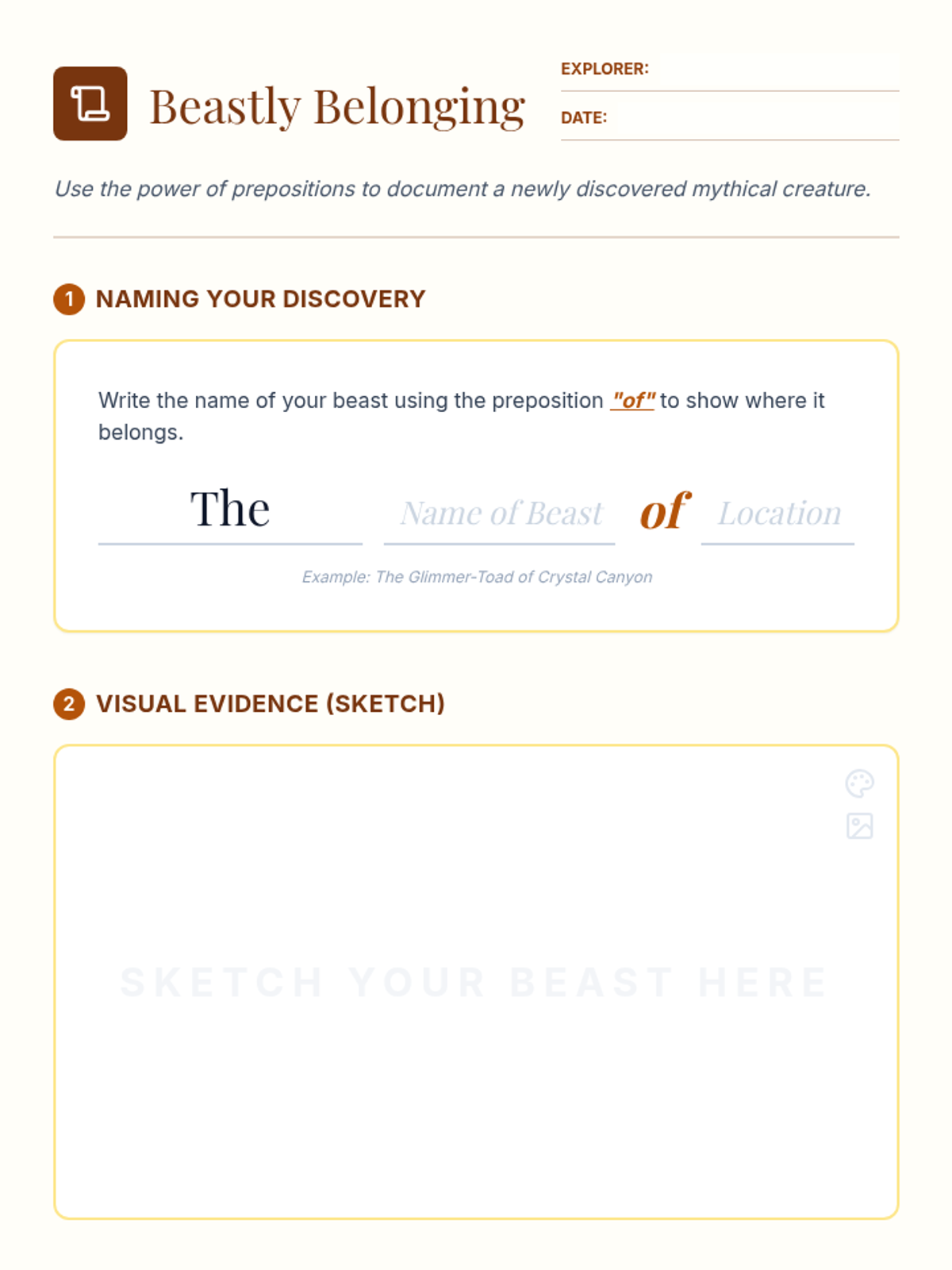 A grammar and creative writing lesson where students use the prepositions 'of' and 'with' to create mythical creatures and descriptive titles.
