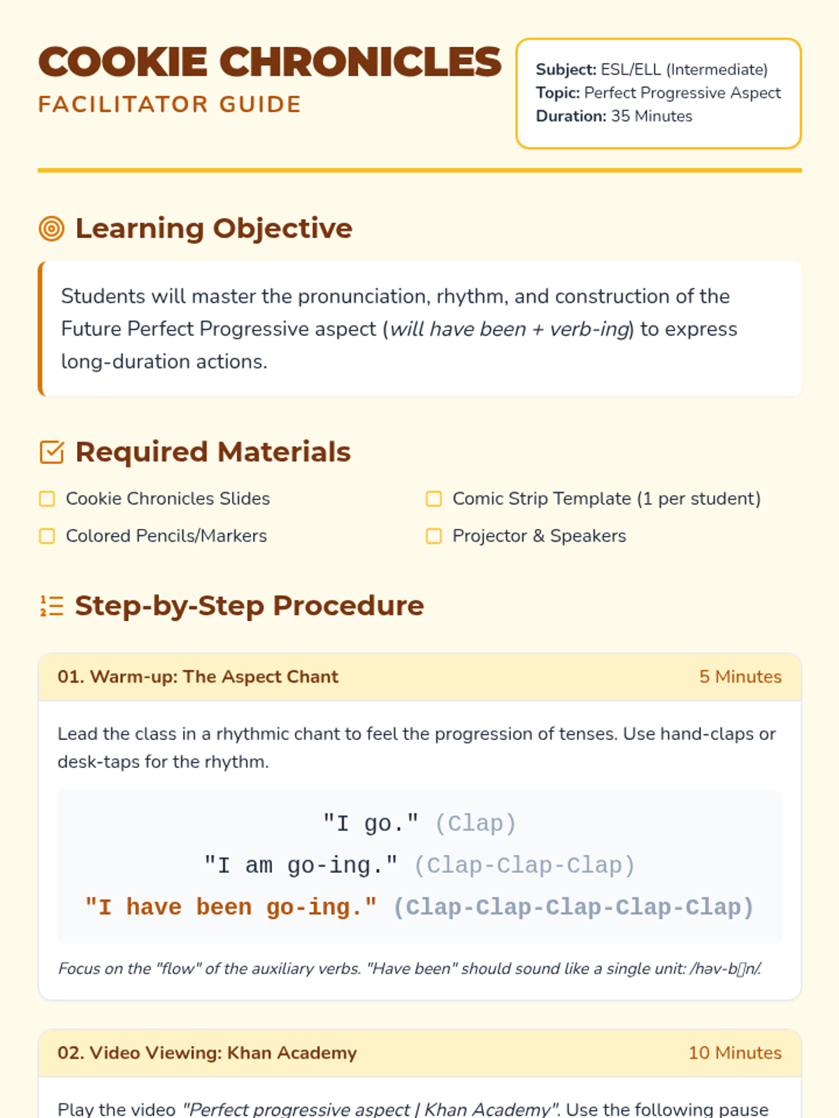 An intermediate ESL lesson focusing on the pronunciation and rhythm of the perfect progressive aspect, using a humorous 'Cookie Chronicles' theme and a Khan Academy video.