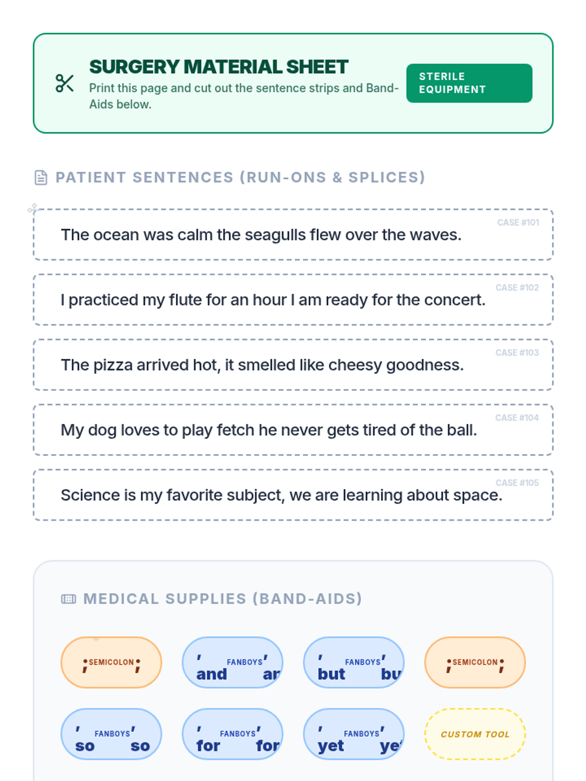 A quick, high-impact grammar warm-up focused on using commas and coordinating conjunctions (FANBOYS) to join independent clauses correctly. Students act as 'Sentence Surgeons' to repair broken compound sentences.