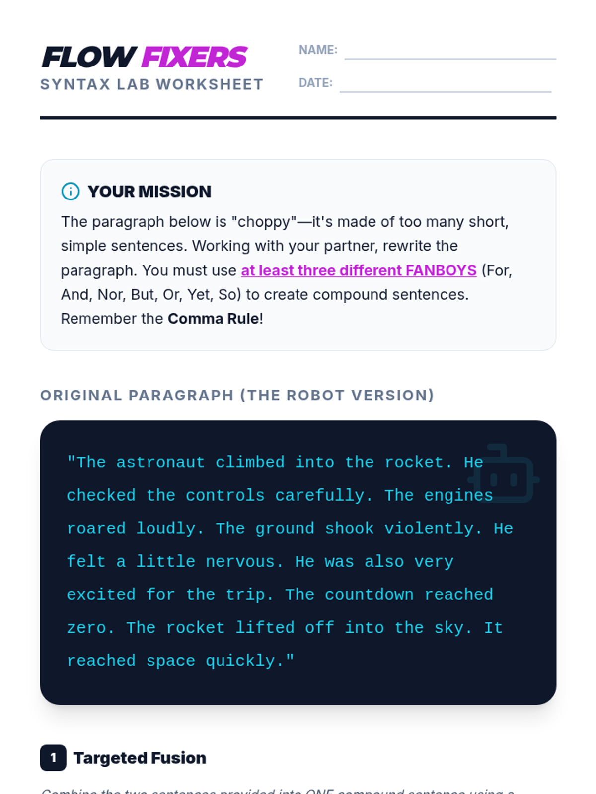 Students will learn to identify choppy writing and use coordinating conjunctions (FANBOYS) to create fluent compound sentences. The lesson culminates in a paragraph rewriting activity where students 'operate' on a text to improve its flow.
