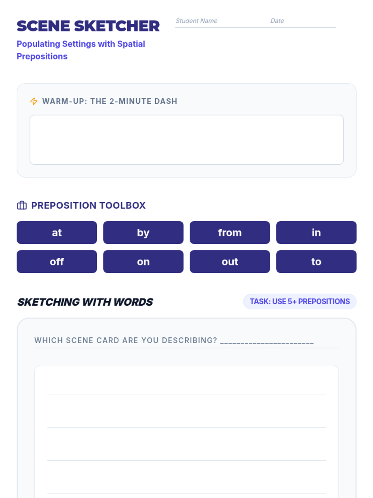 A lesson focusing on using spatial prepositions (at, by, from, in, off, on, out, to) to enhance descriptive writing through visual prompts and narrative scene-building.