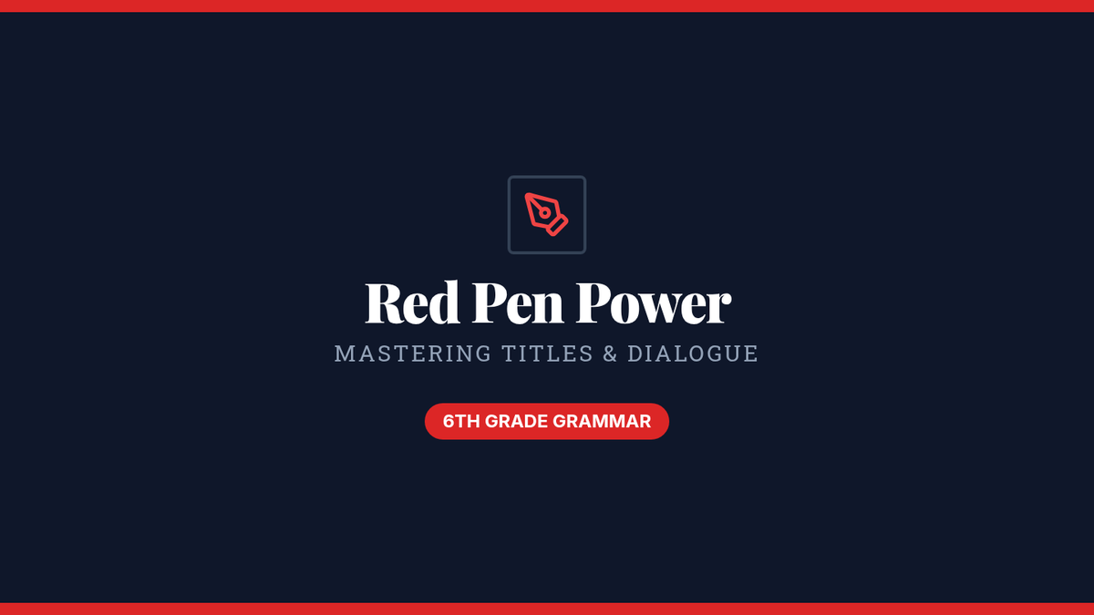 A 6th-grade grammar lesson focusing on the 'Big vs. Small' rule for title formatting and the basics of punctuating dialogue. Students act as editors to correct a messy manuscript using rules from a Khan Academy video.