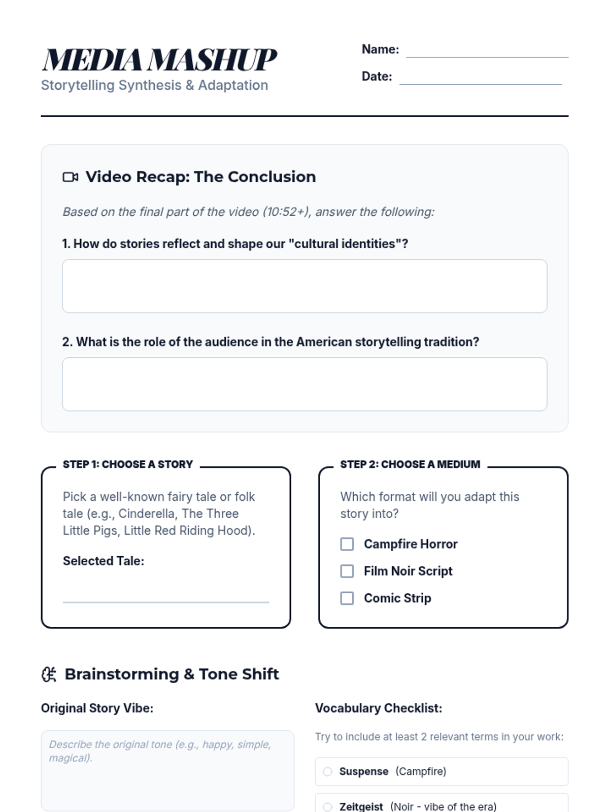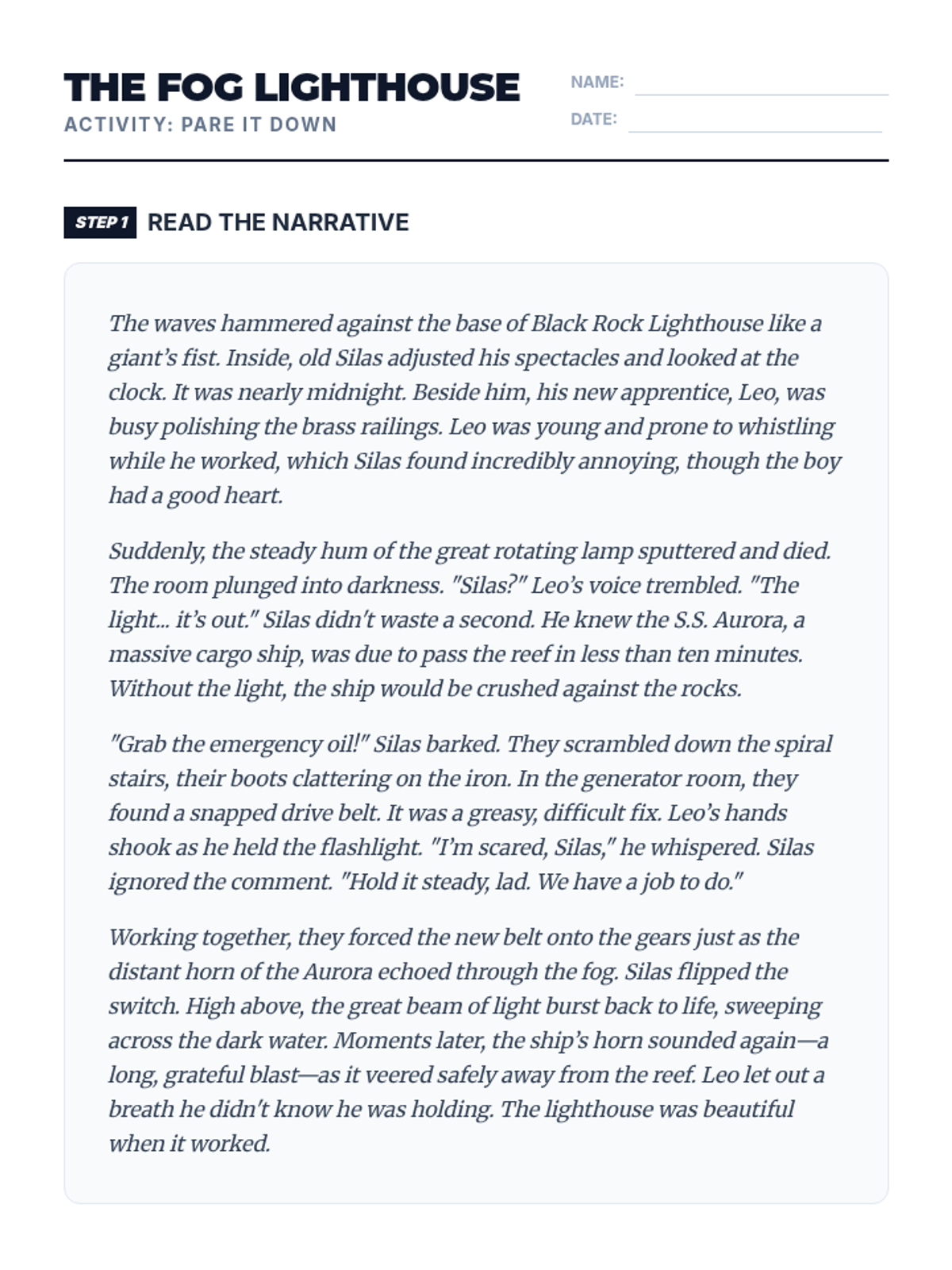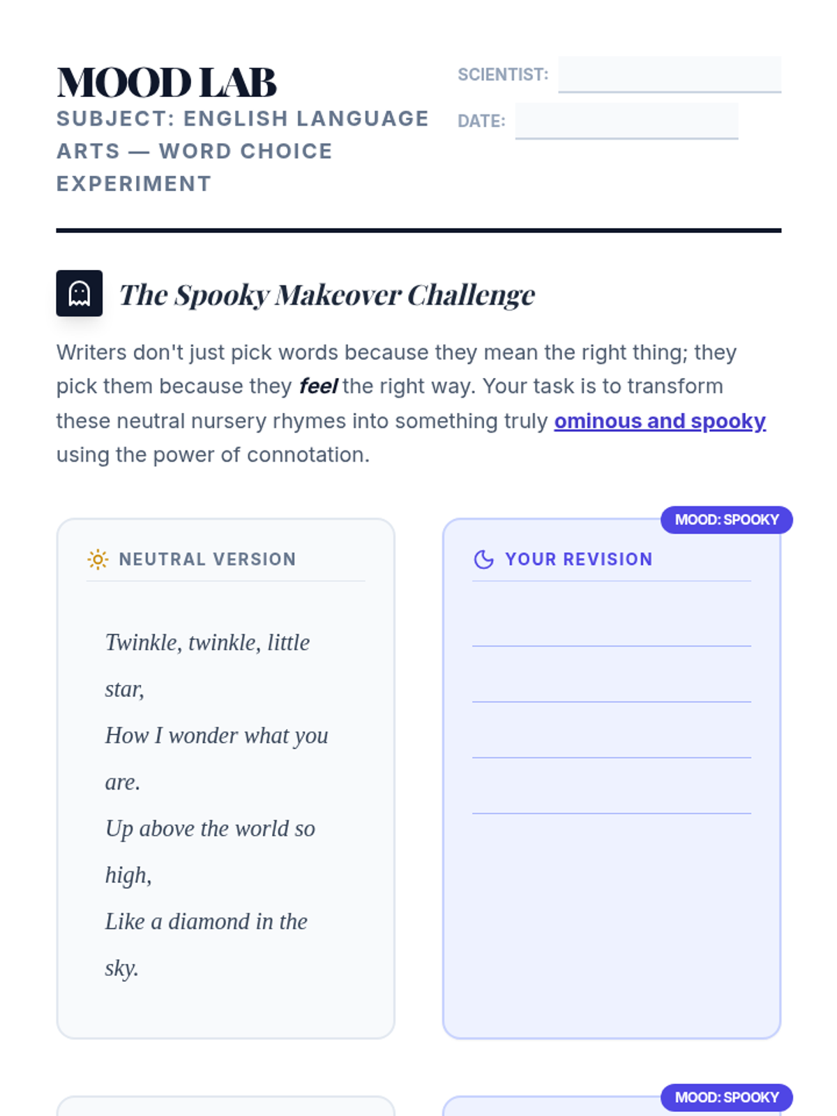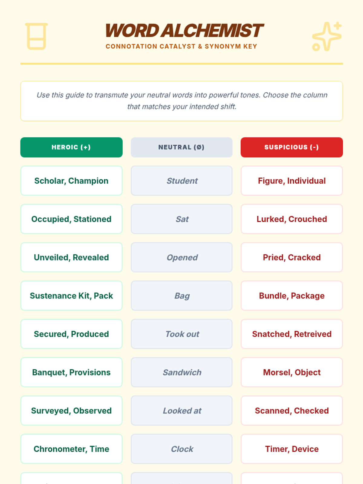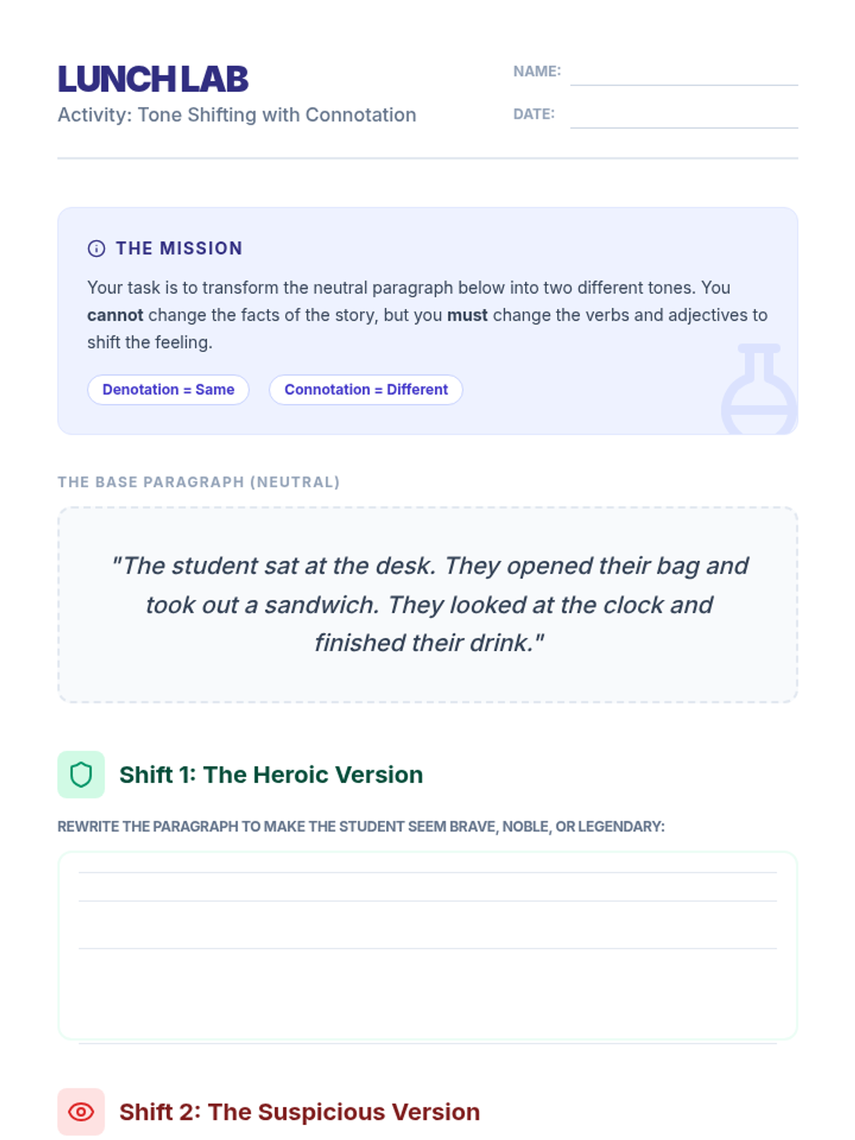 Students explore how connotation changes the tone of a text without altering its literal meaning. They will transform a neutral paragraph into two distinct versions: one heroic and one suspicious, using specific word choices.