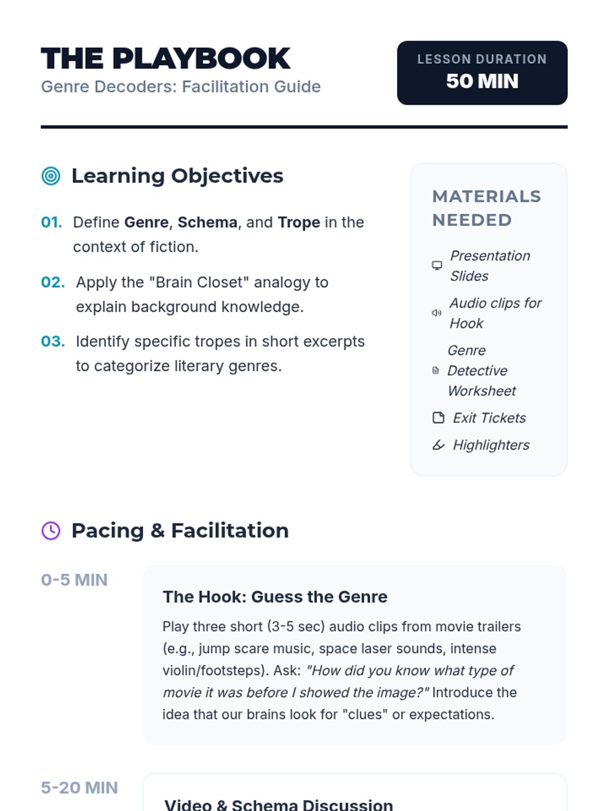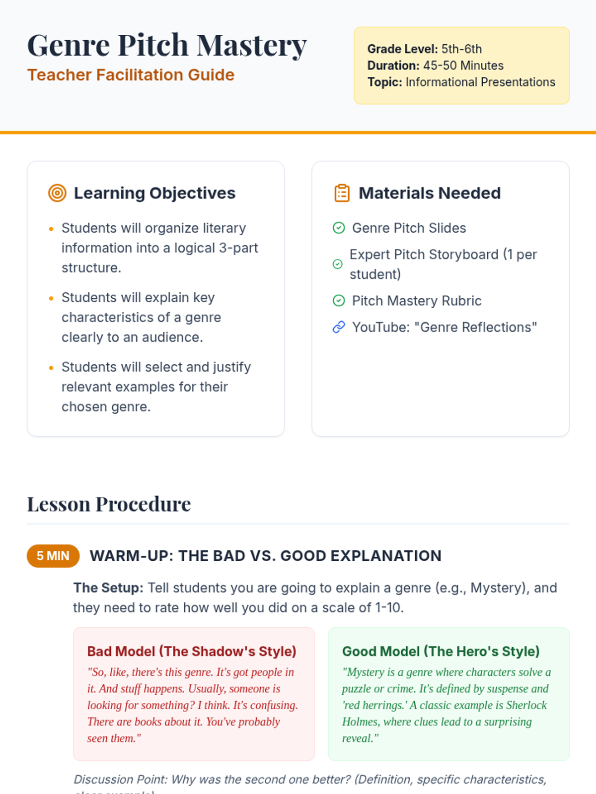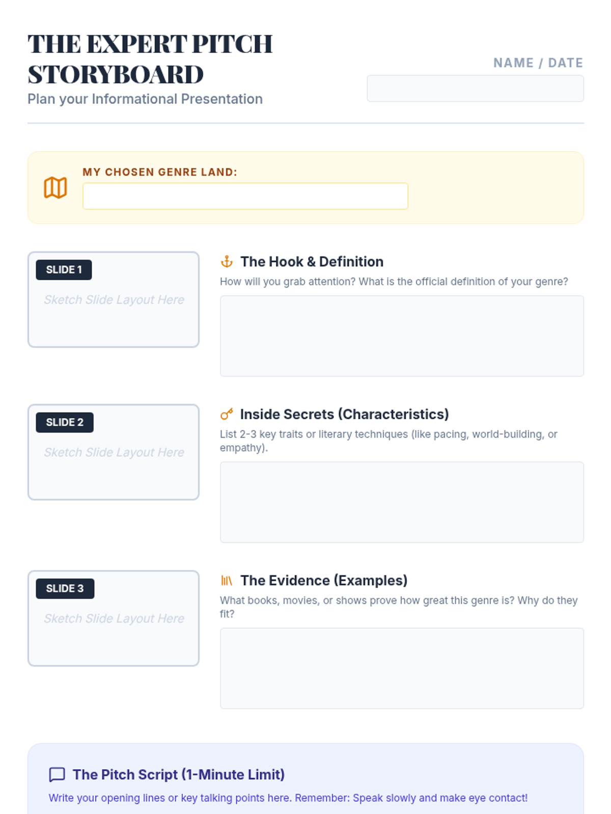 Students will learn how to organize and deliver an effective informational pitch about a literary genre, using a 3-slide storyboard structure to plan their presentation. This lesson connects to the 'Genre Reflections' video and culminates in a small-group pitch session.