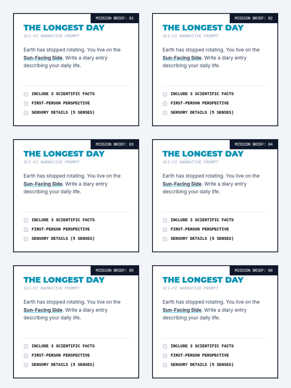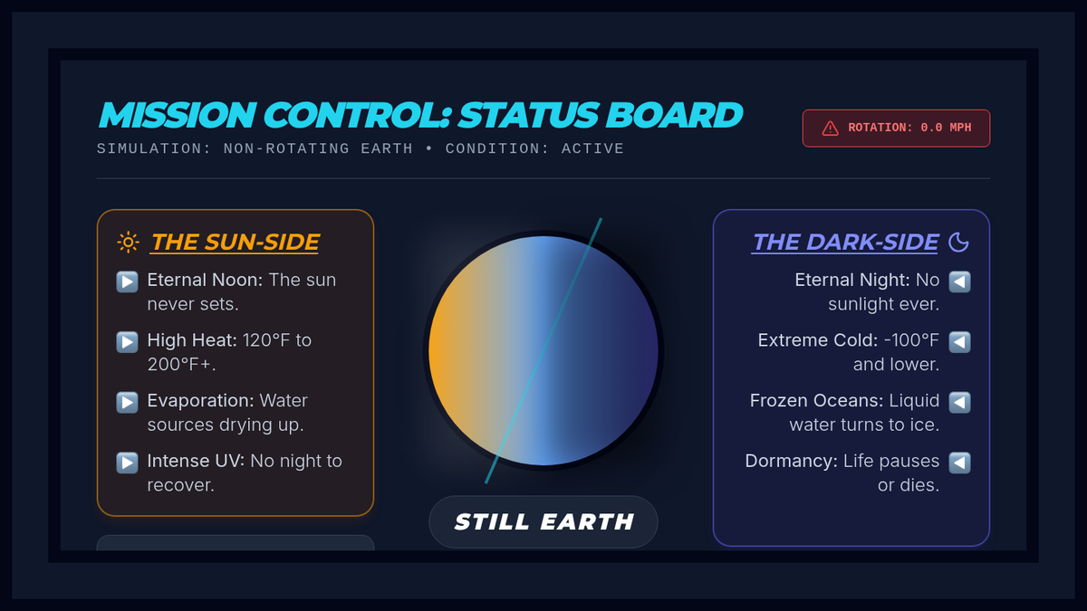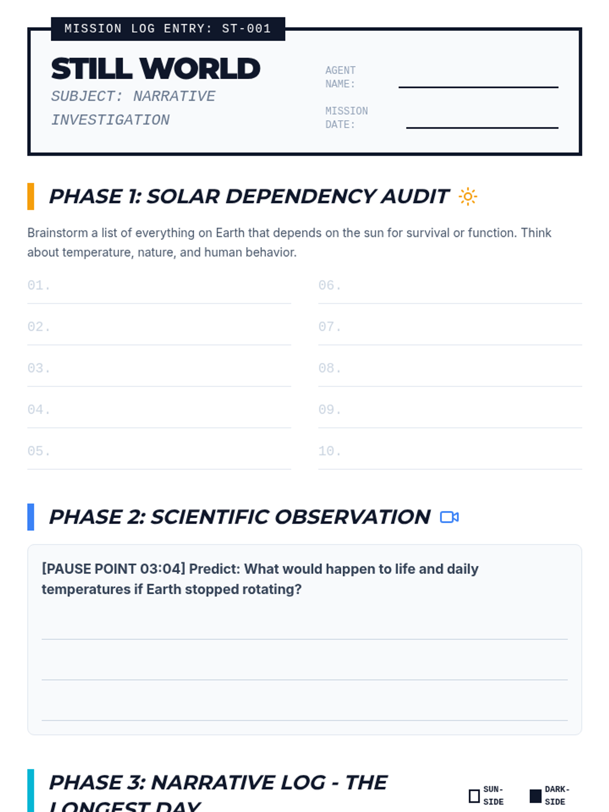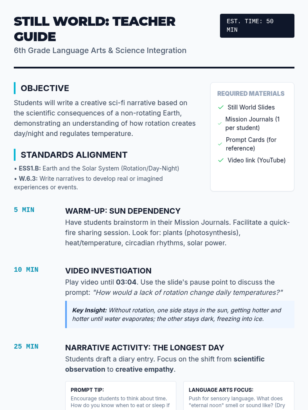 A 6th-grade Language Arts and Science integration lesson where students explore the consequences of a non-rotating Earth through sci-fi narrative writing. Students analyze Earth's rotation, observe scientific predictions, and draft a diary entry from a world of eternal daylight.