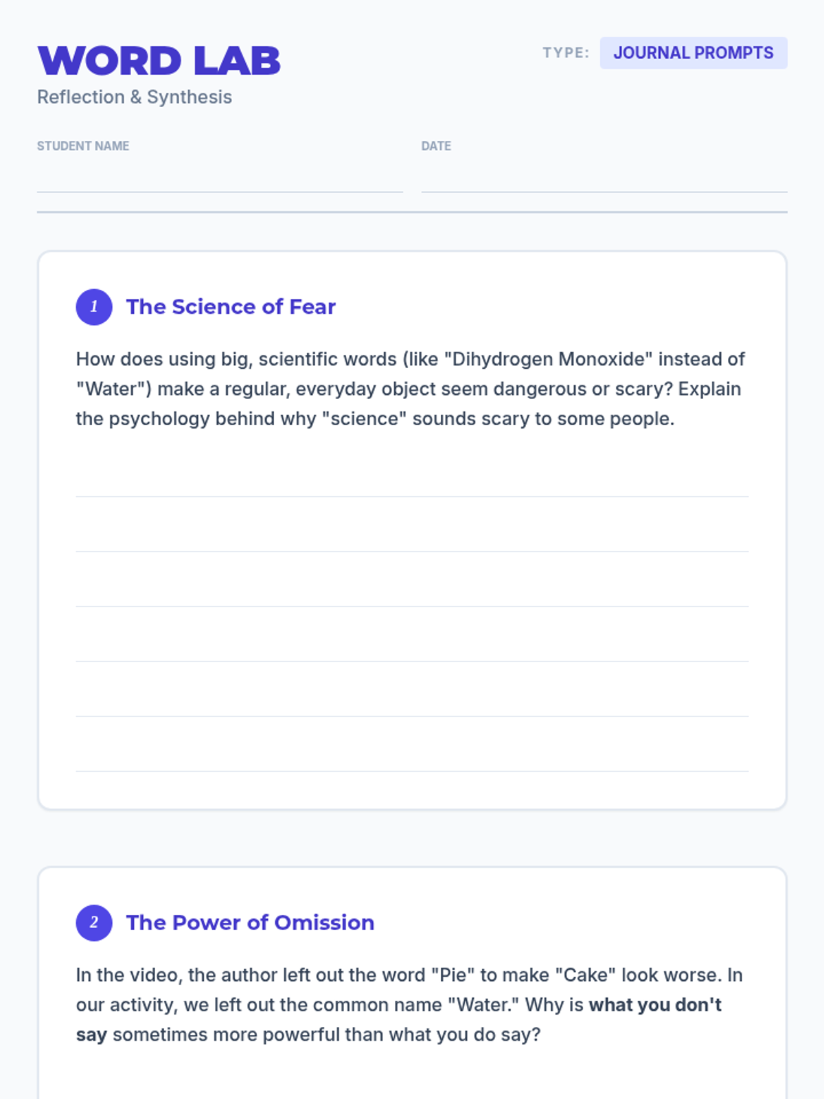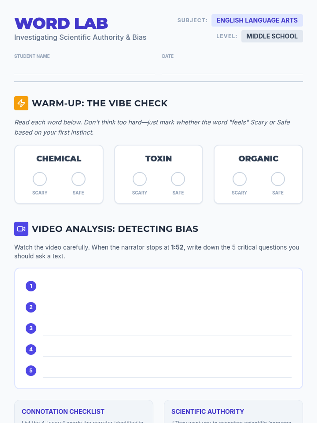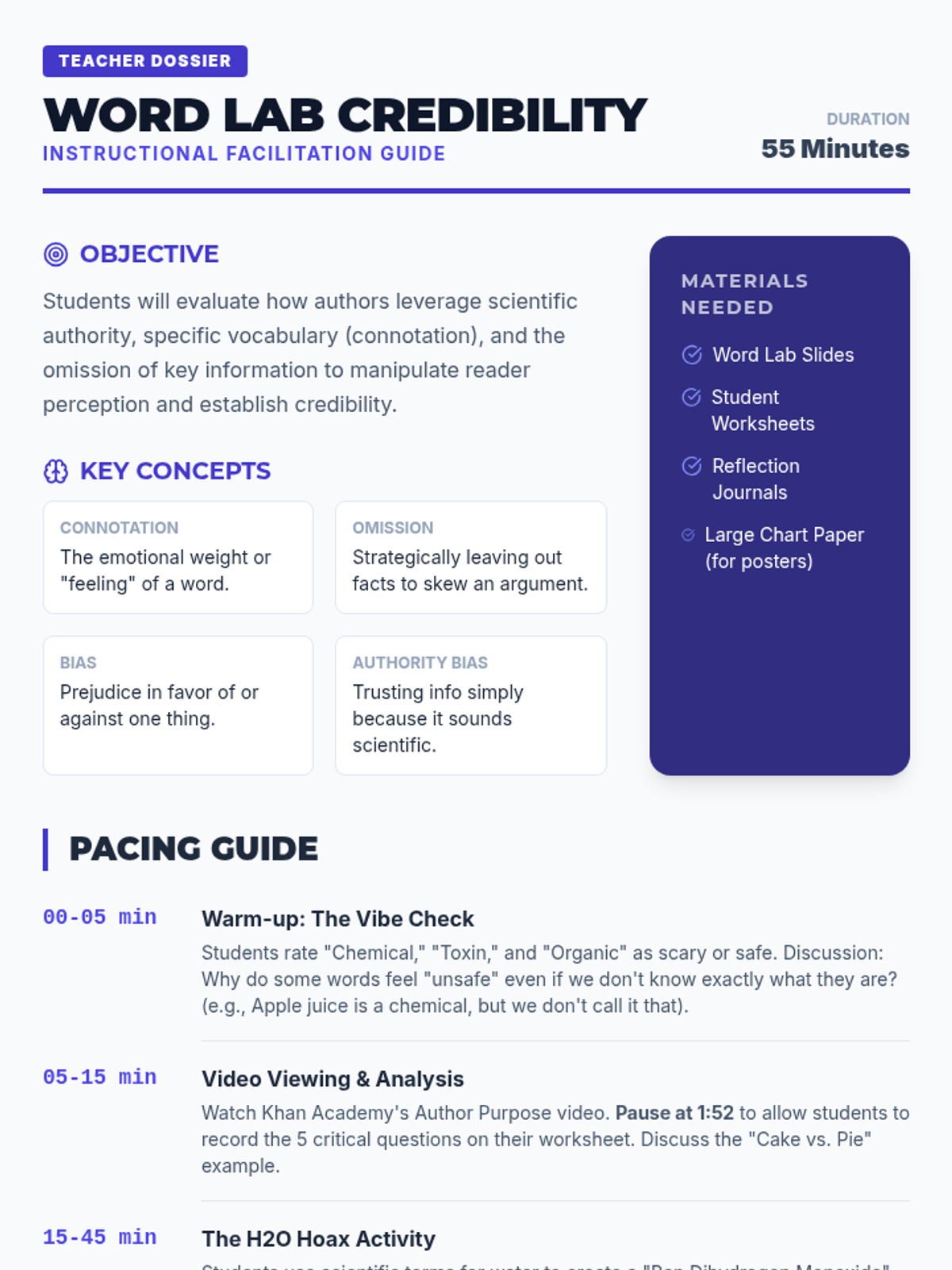 Students explore how authors use scientific vocabulary and 'scary' connotations to manipulate reader perception and credibility, culminating in a 'Dihydrogen Monoxide' propaganda activity.