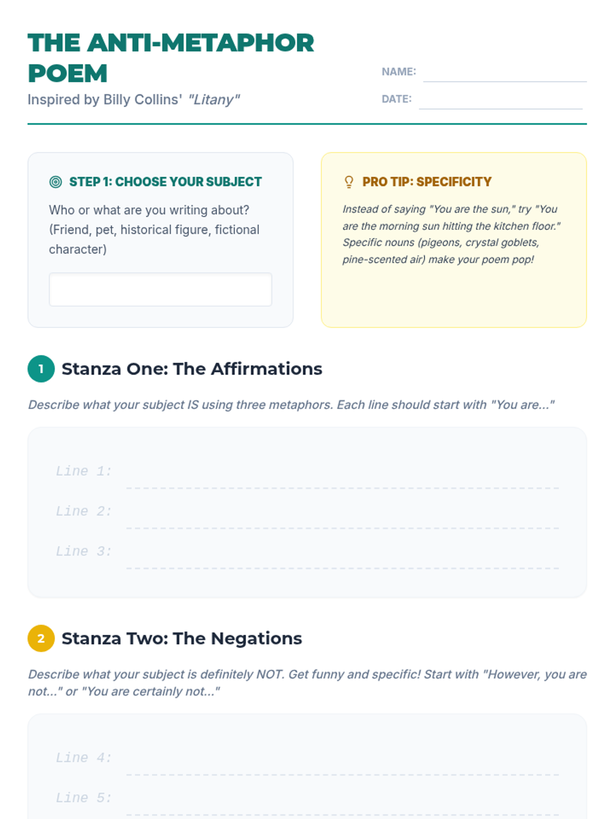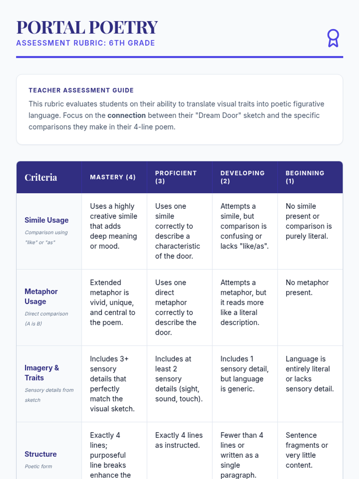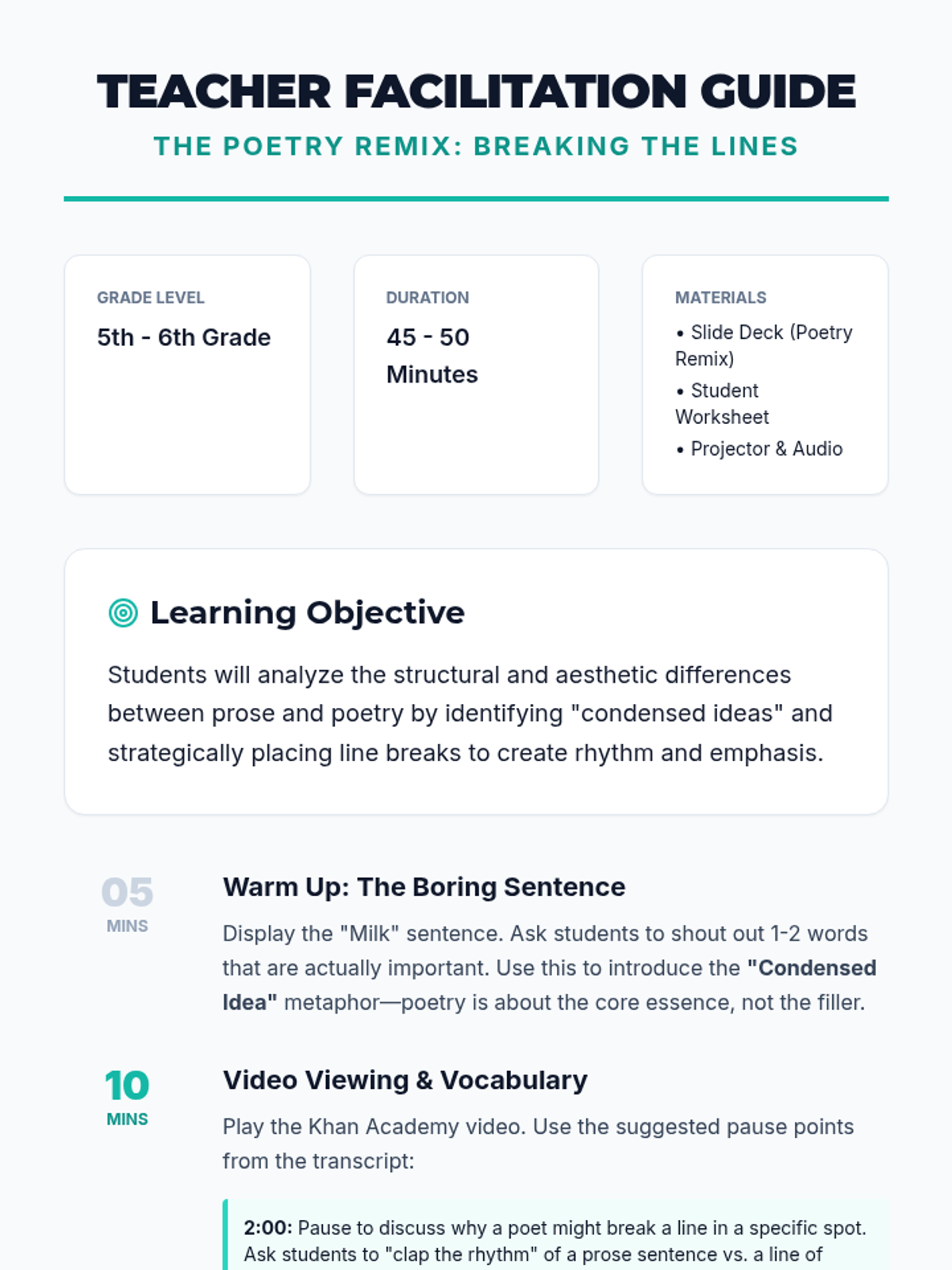 Poetry ElementsStanza structure, rhyme schemes, and meter across various poetic forms. Examines figurative language like metaphors and similes alongside sound devices such as alliteration and onomatopoeia.