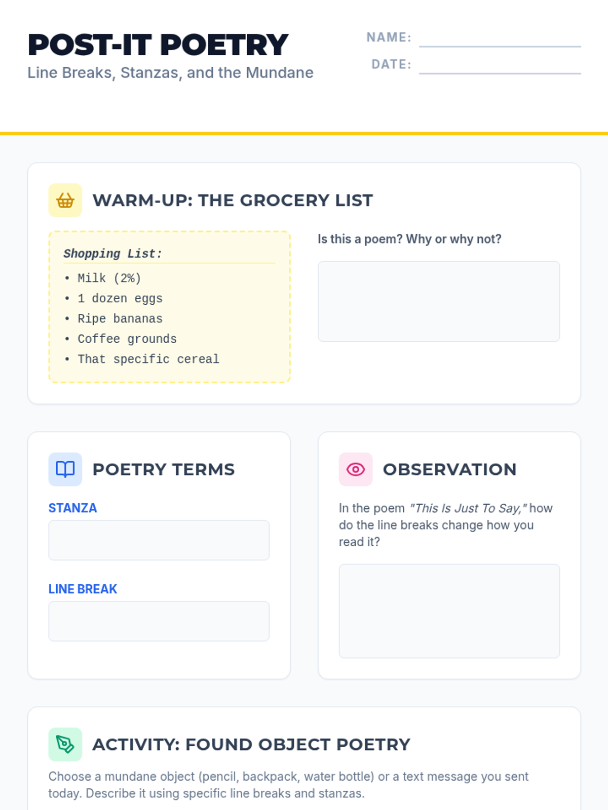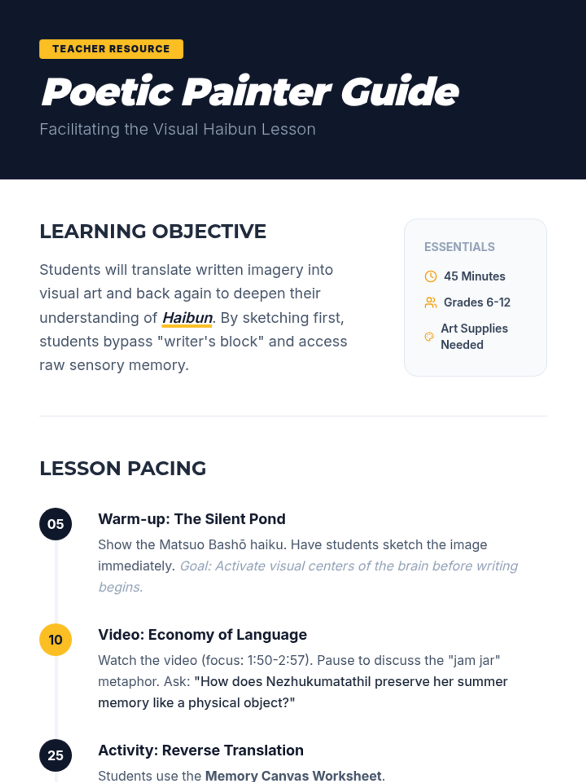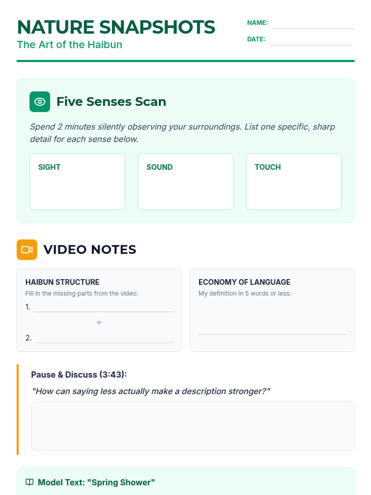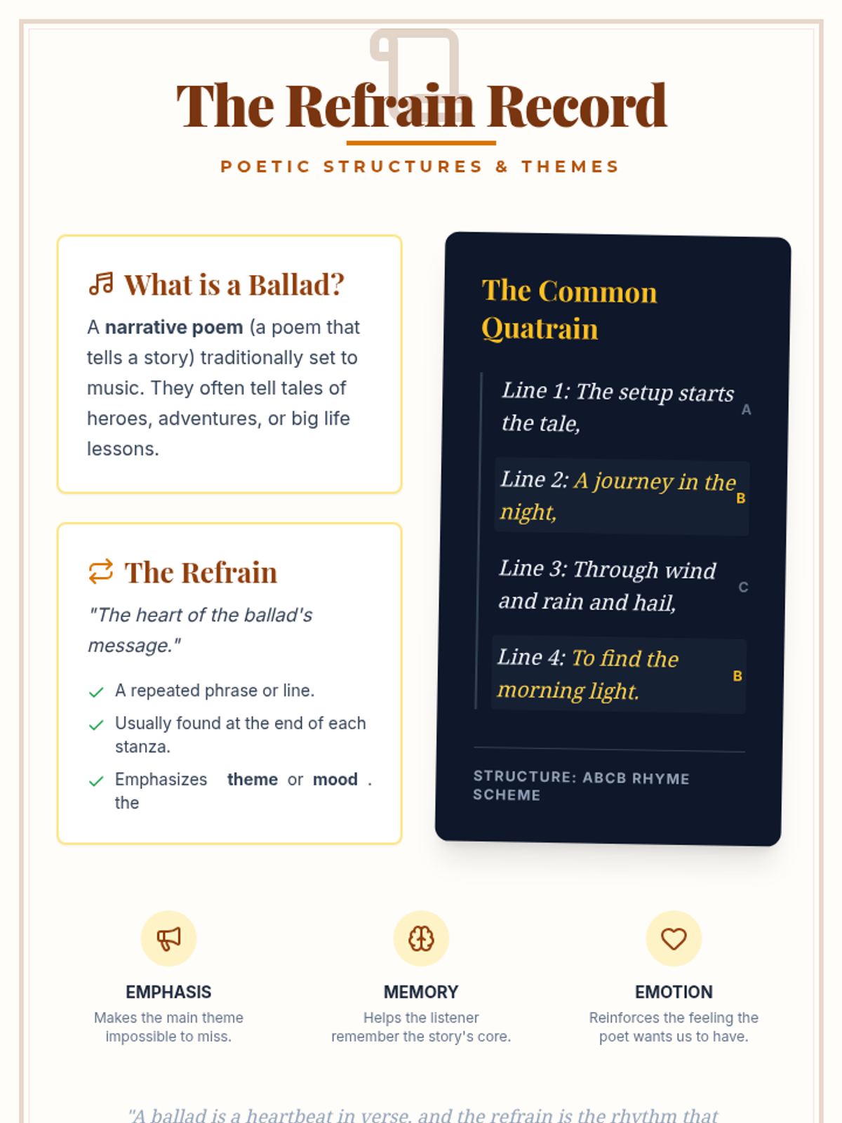Poetry ElementsStanza structure, rhyme schemes, and meter across various poetic forms. Examines figurative language like metaphors and similes alongside sound devices such as alliteration and onomatopoeia.