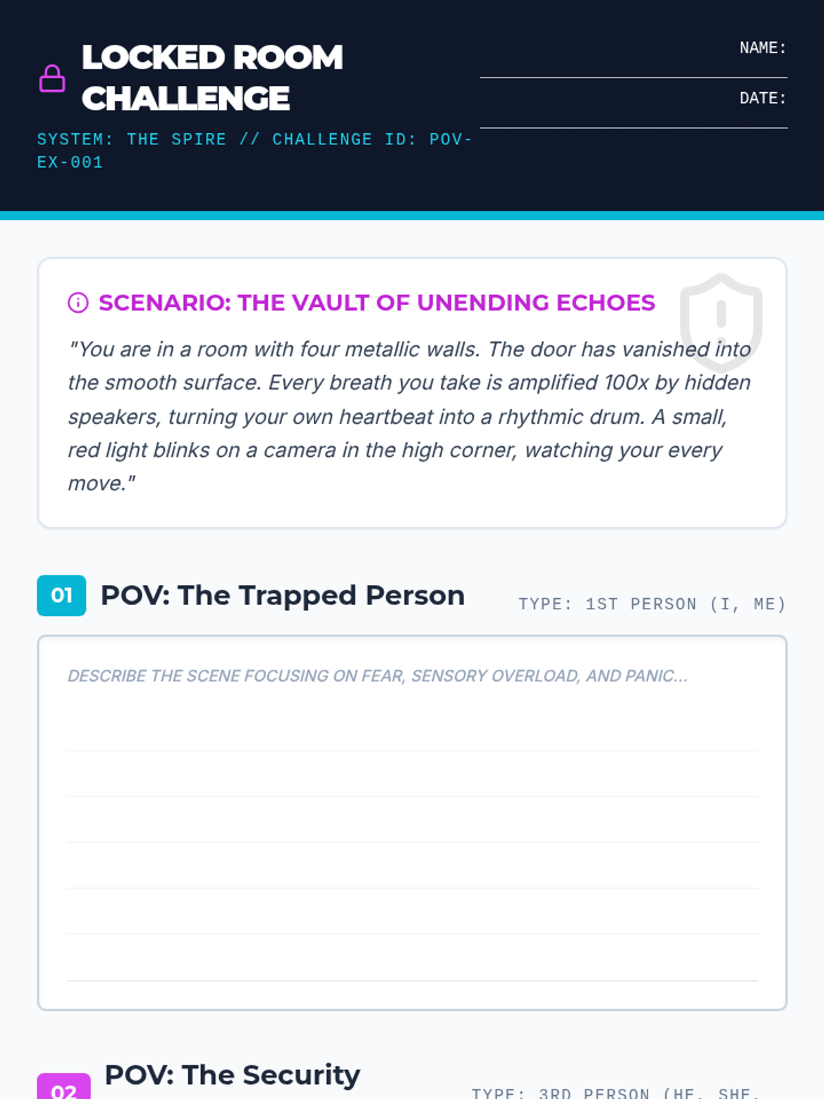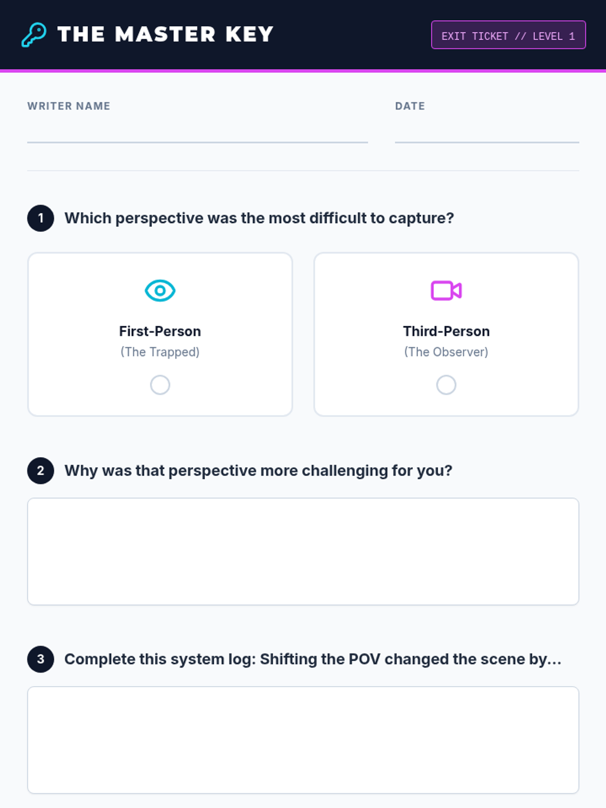 A high-energy creative writing lesson where students navigate a "Writer's Escape Room." They explore how shifting between First-Person (trapped/fearful) and Third-Person (detached/observer) points of view changes the tone and tension of a scene.