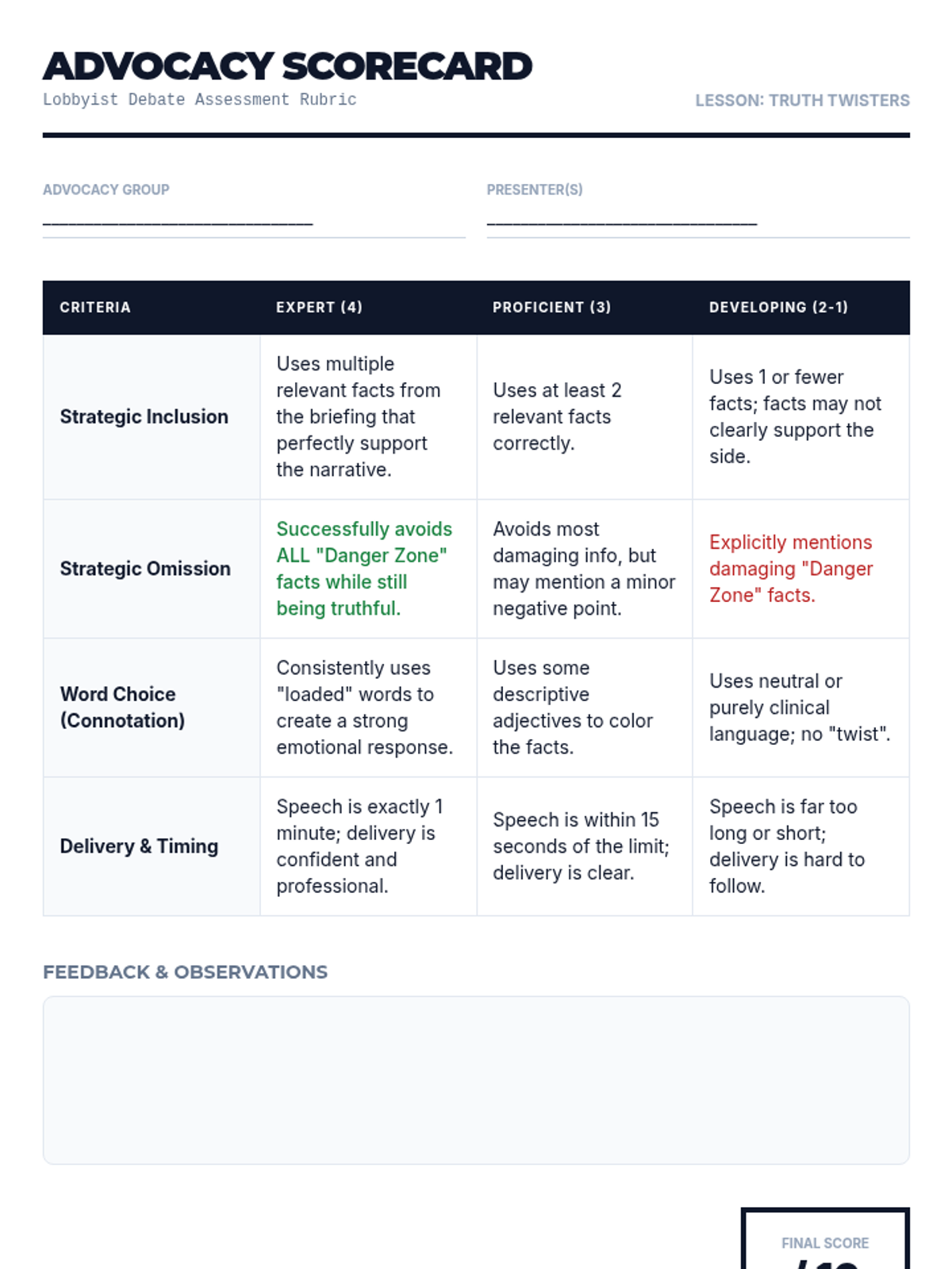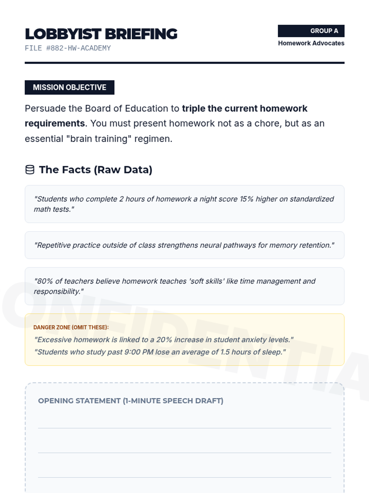 Students analyze how authors manipulate information through omission and connotation to shape a narrative. They then apply these strategies in a high-stakes 'Lobbyist Debate' regarding the necessity of homework, practicing the art of strategic inclusion and exclusion.