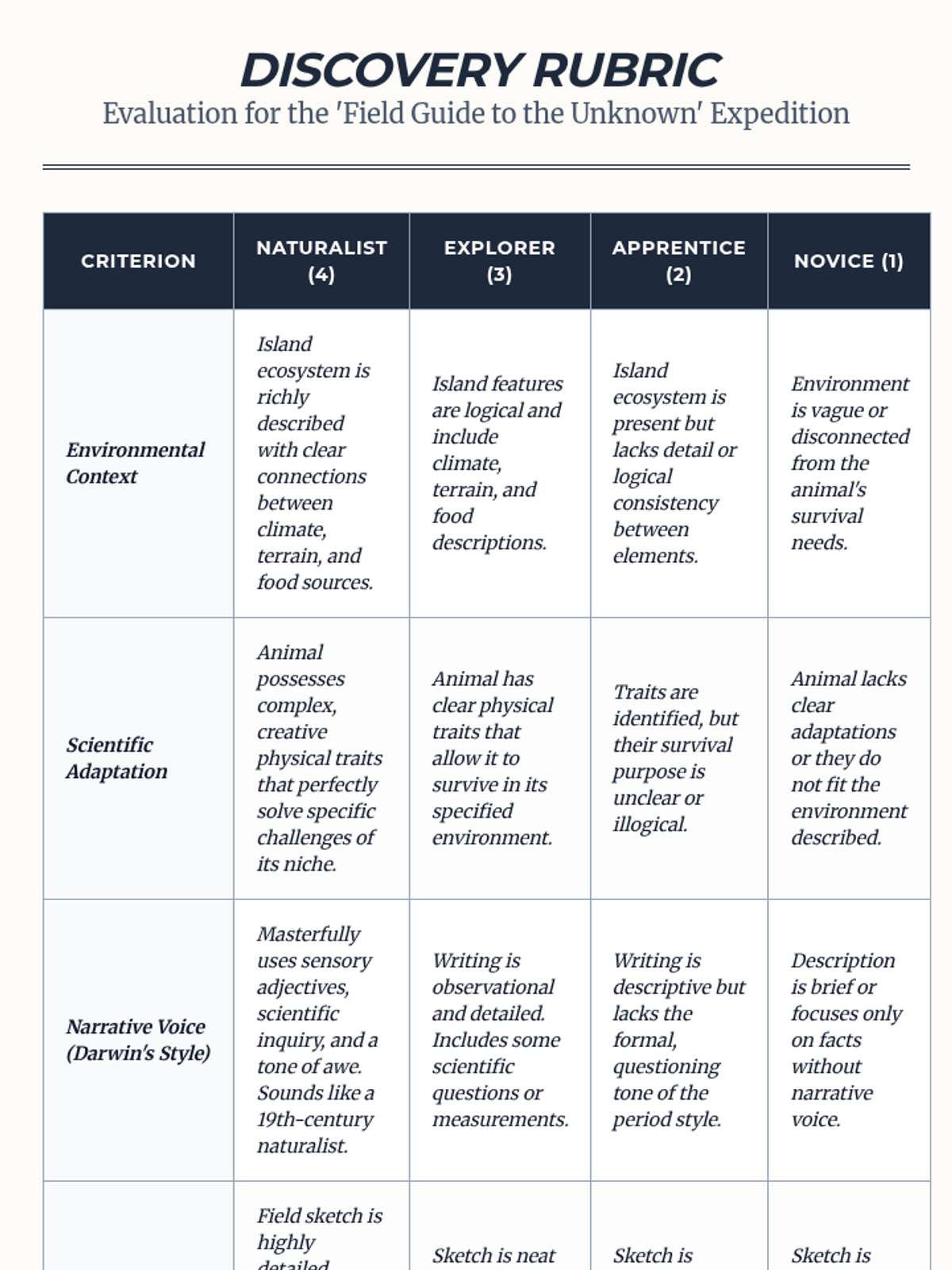 A creative writing lesson merging science and narrative where students invent an island and a species, writing a field guide entry in the style of Charles Darwin.