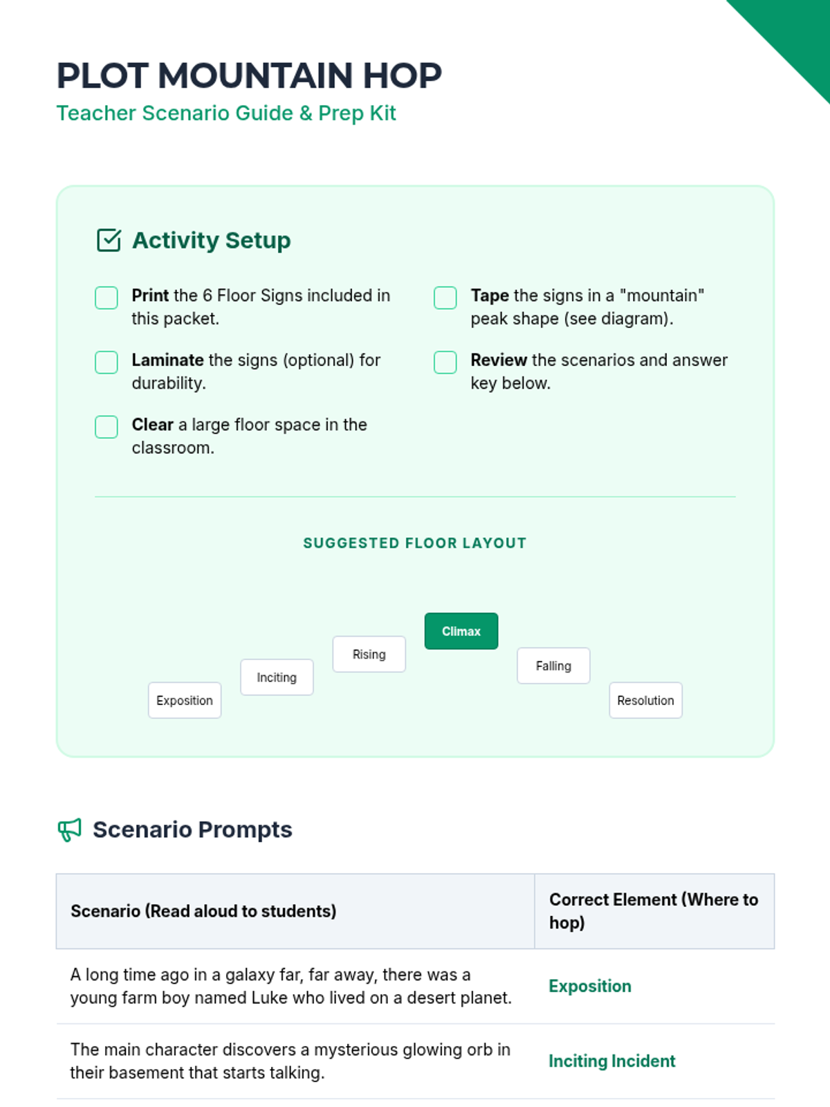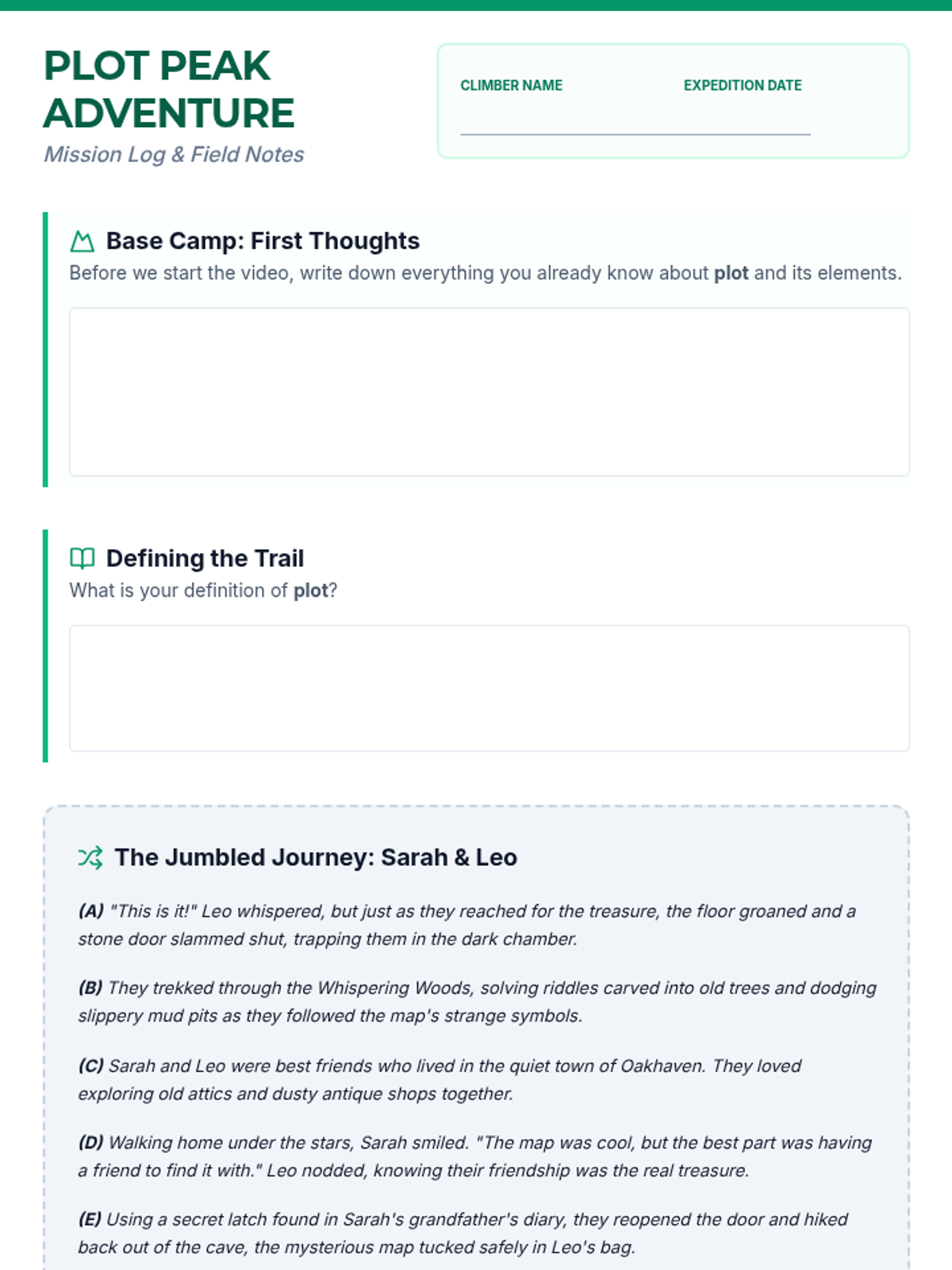 Story ElementsIdentification and analysis of plot, characters, setting, conflict, and resolution. Strengthens reading comprehension by mapping narrative structures and examining how individual components shape a story.