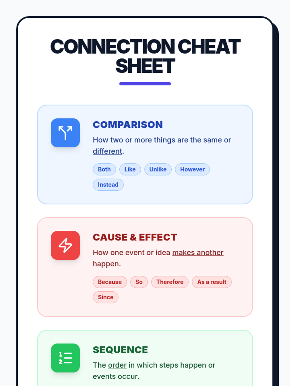 Text StructureOrganizational patterns including cause and effect, compare and contrast, and chronological sequencing. Strengthens comprehension by analyzing how authors arrange information to clarify relationships between ideas.