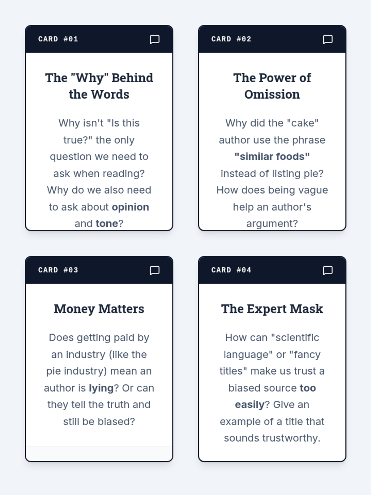 Author's PerspectiveIdentifies the underlying attitudes, biases, and purposes that influence a writer’s presentation of information. Connects text evidence to the author's background and intended impact on the audience.
