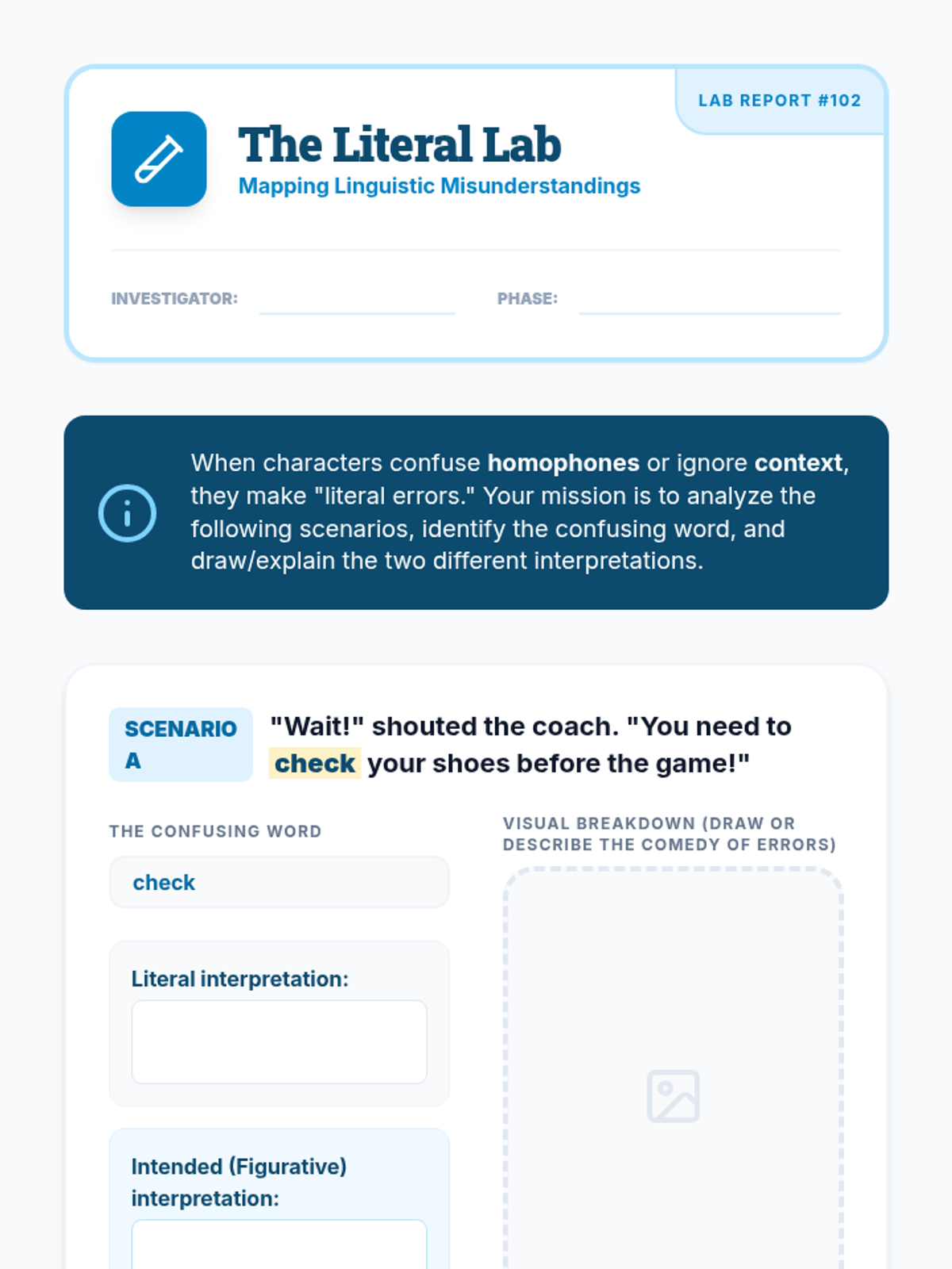 Students analyze the comedy that arises when characters like Amelia Bedelia confuse homophones or take literal meanings.