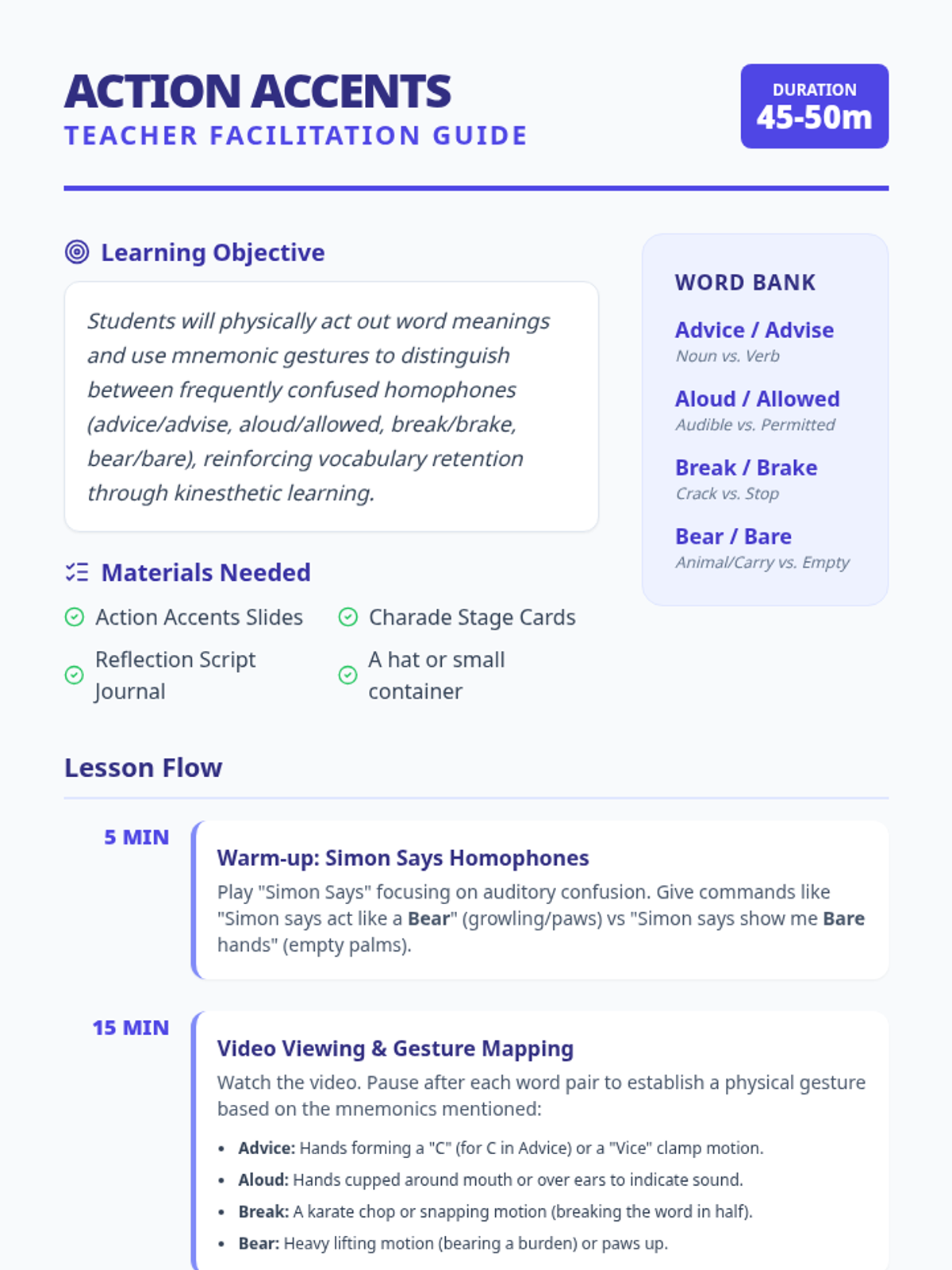 Students will physically act out word meanings for commonly confused homophones (advice/advise, aloud/allowed, break/brake, bear/bare) to reinforce spelling and retention through movement and mnemonics.