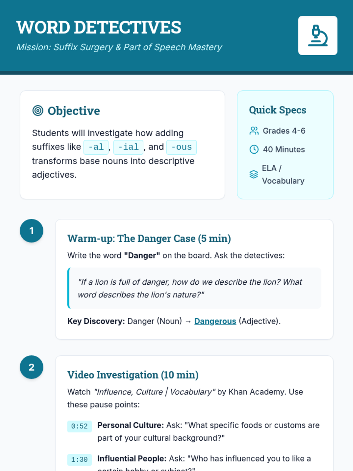 A lesson for grades 4-6 where students act as 'word detectives' to explore how suffixes change nouns into adjectives, featuring a Khan Academy video on culture and influence.