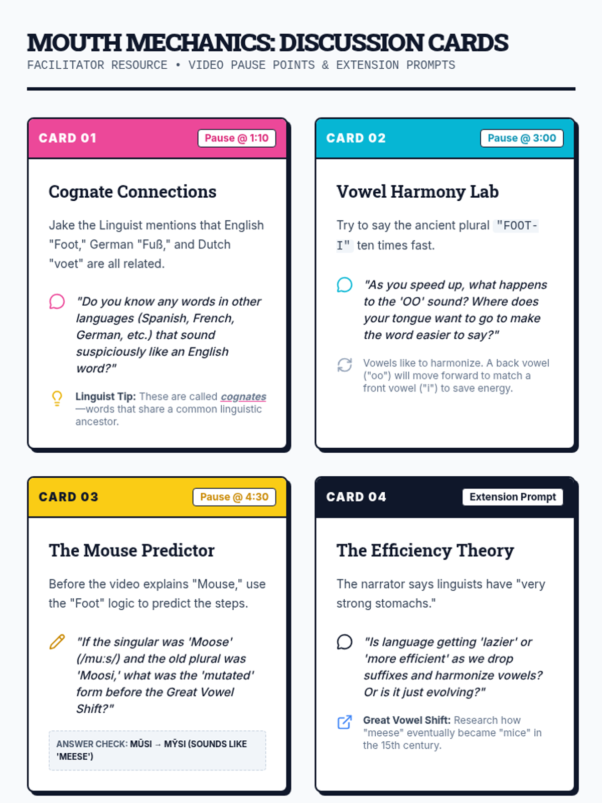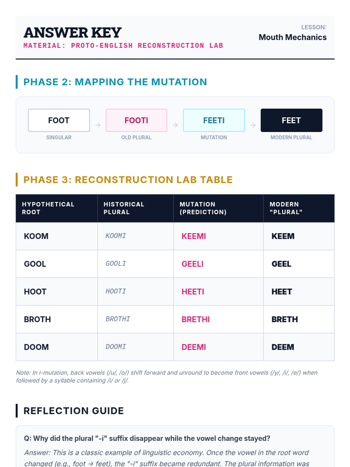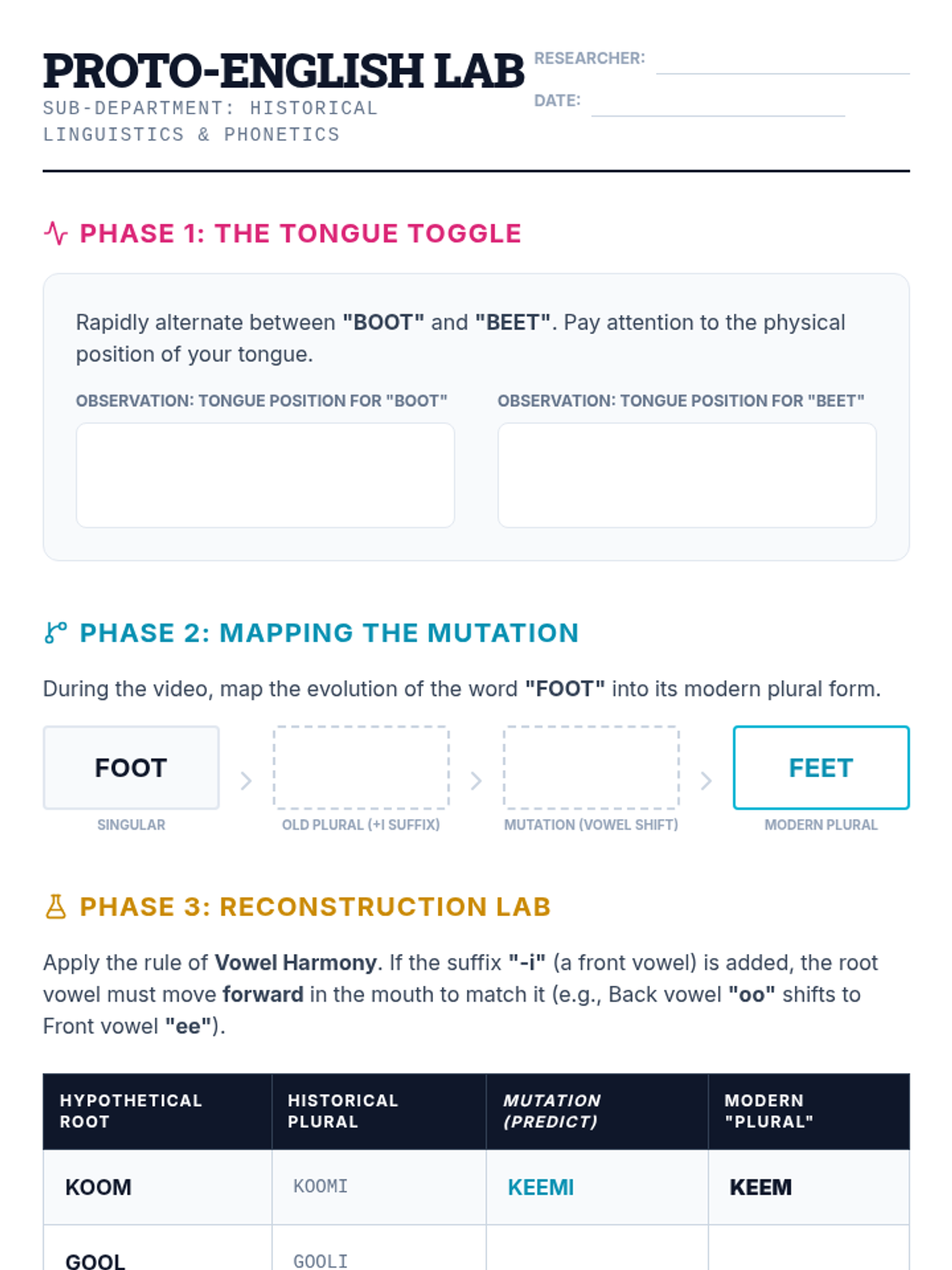 Students will explore the historical linguistic processes of i-mutation and vowel harmony, learning how the physical mechanics of the mouth shaped the 'mutant plurals' we use in Modern English today.