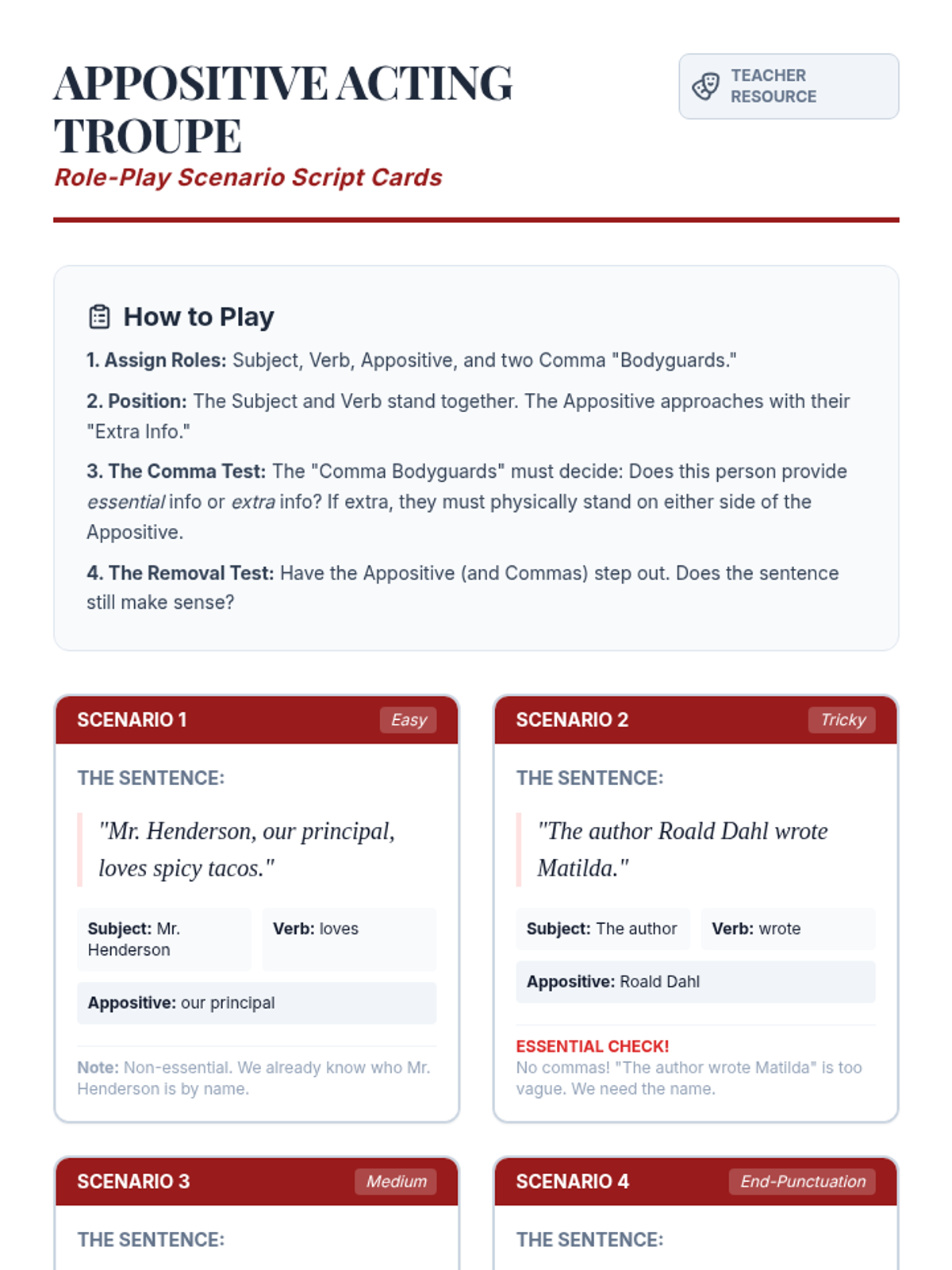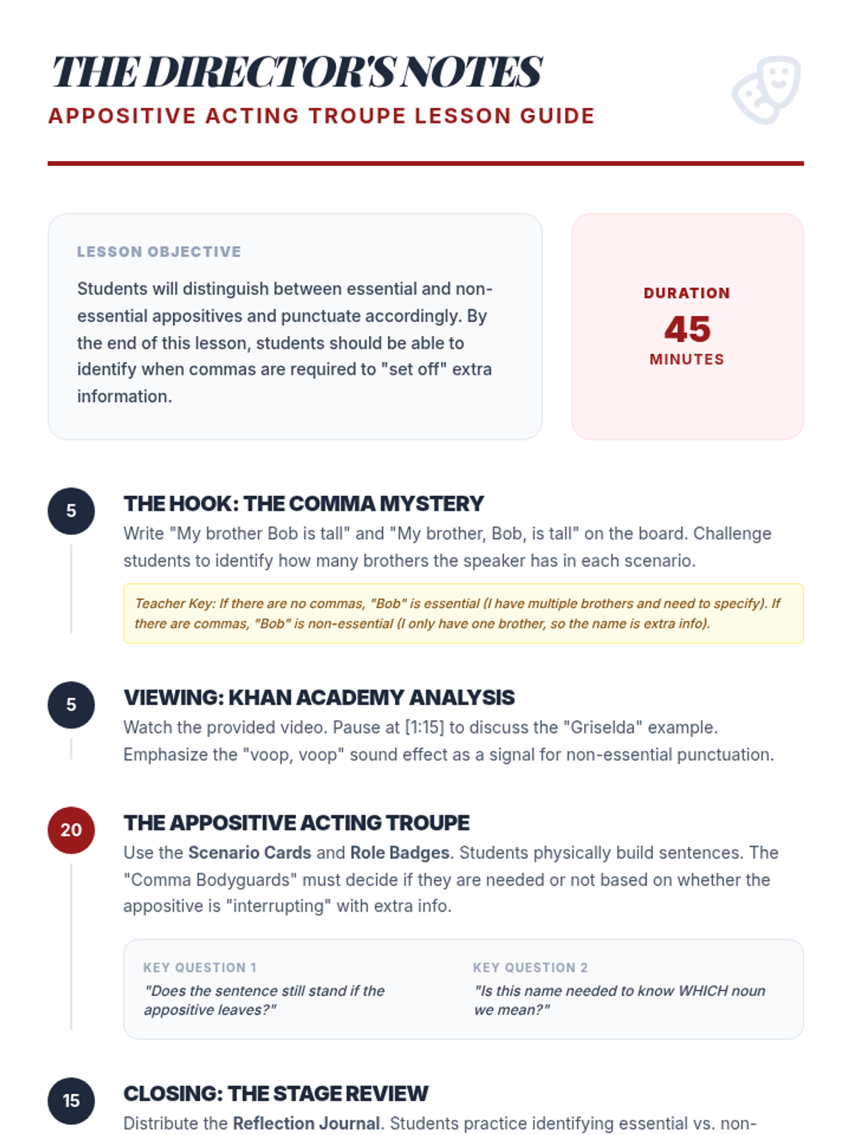 A high-energy grammar lesson where students use role-play and video analysis to master the use of commas with essential and non-essential appositives. Students physically arrange themselves into sentences to see how punctuation 'interrupts' to provide extra detail.