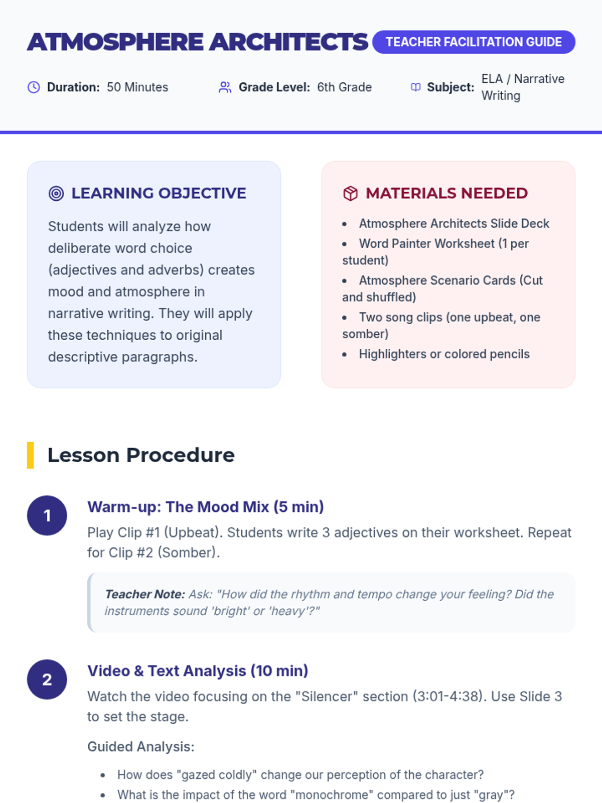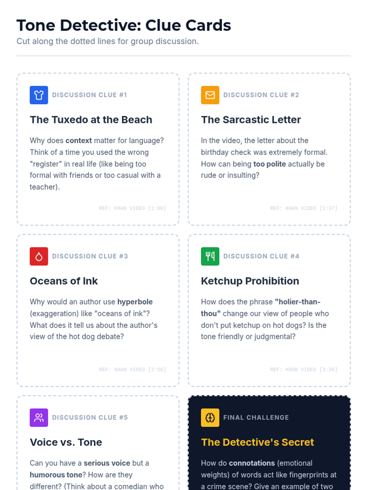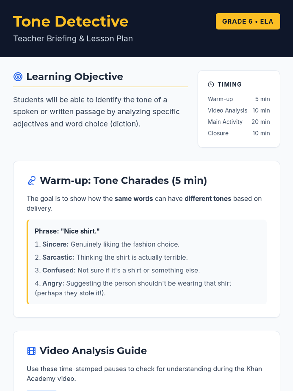 Students will learn to identify tone through word choice and register using a 'Tone Detective' theme. The lesson includes a video analysis of Khan Academy's tone lesson, an emoji-based adjective analysis activity, and a writing extension.