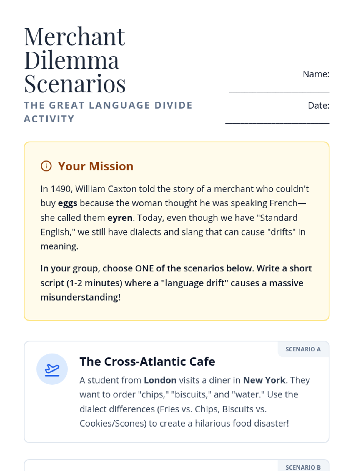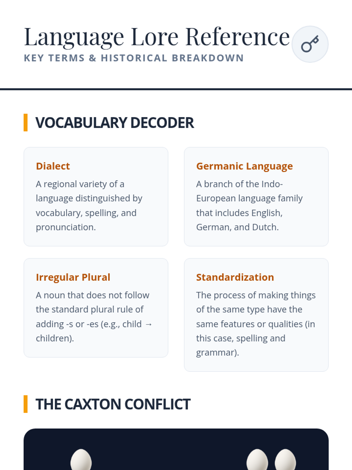 This lesson explores how geography and the absence of mass communication led to the development of diverse English dialects, using the historical anecdote of William Caxton's 'Eggs vs. Eyren' confusion as a primary case study. Students will analyze the Germanic roots of English grammar and the impact of modern technology on linguistic standardization.