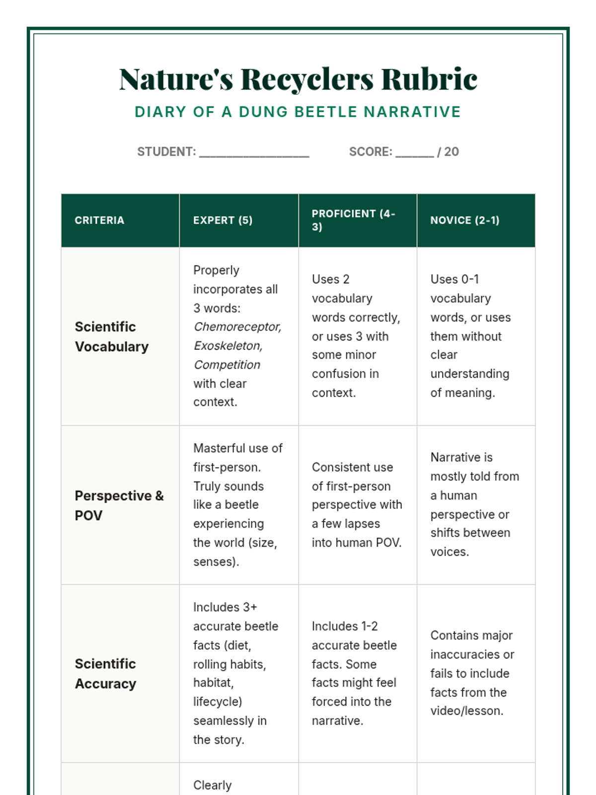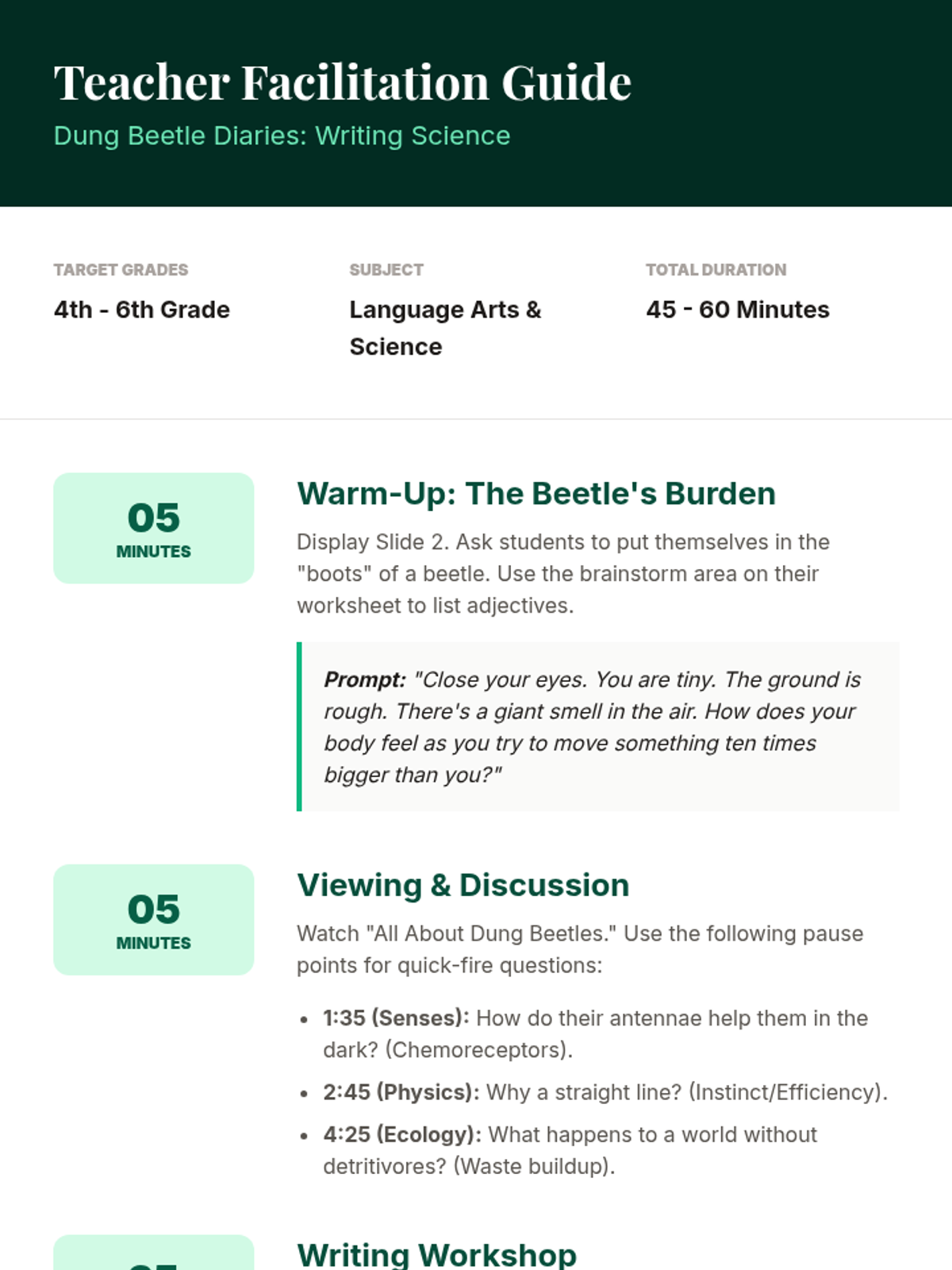 A Language Arts lesson for 4th-6th grade where students write a narrative from the perspective of a dung beetle, blending creative writing with scientific facts about anatomy, senses, and ecology.
