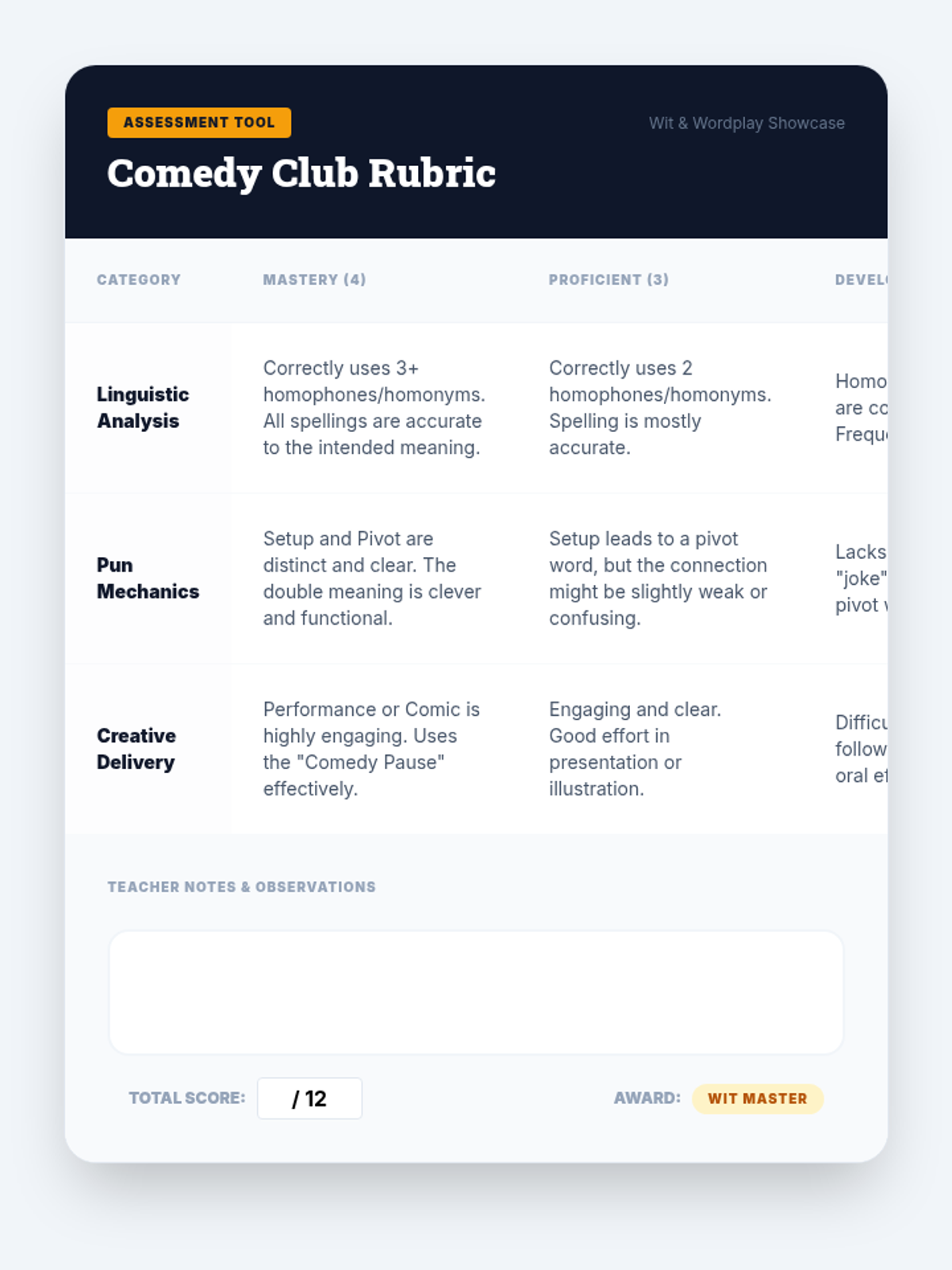 Students apply their wordplay skills to write and perform their own jokes or comic strips in a 'Comedy Club' format.