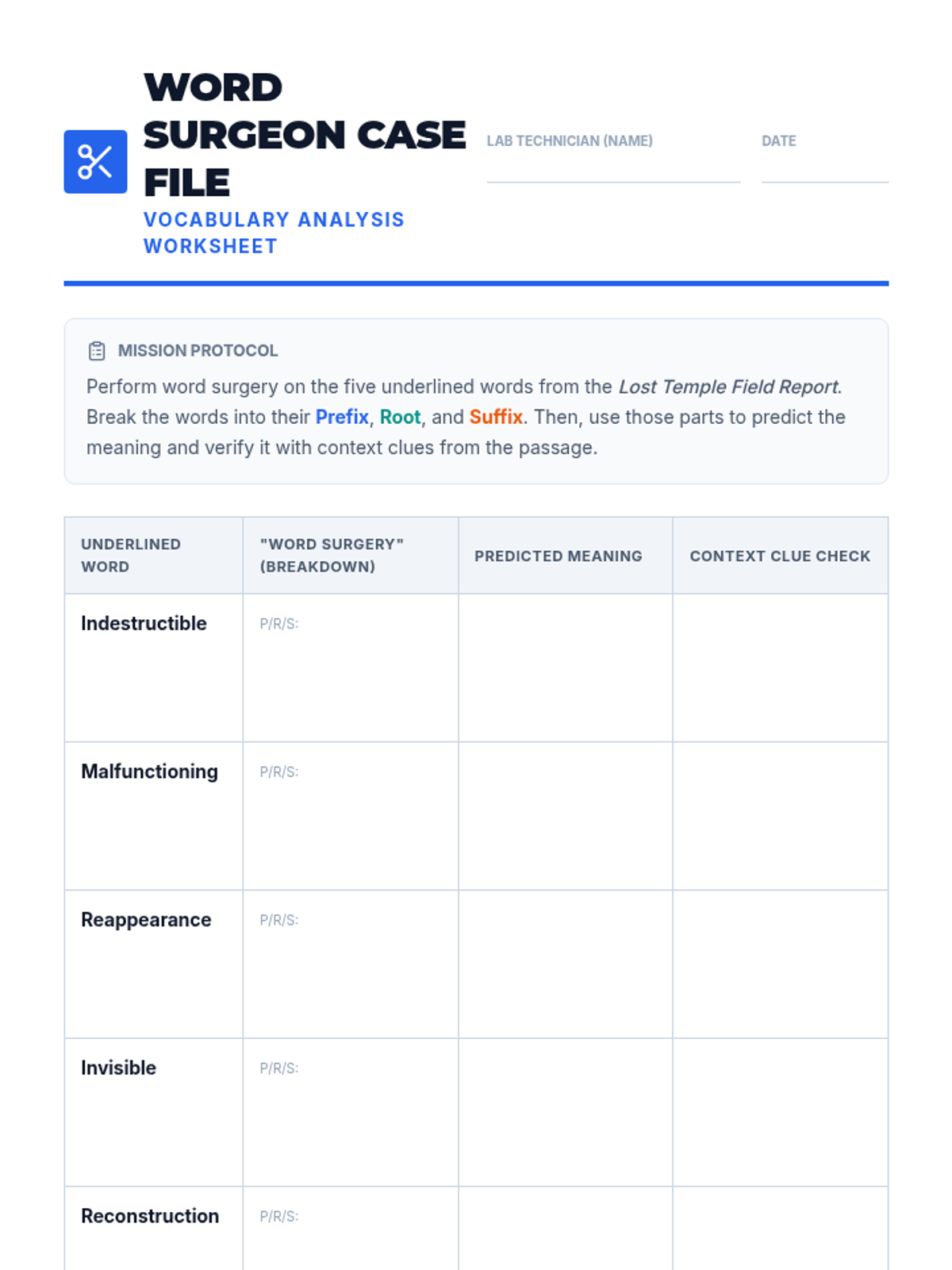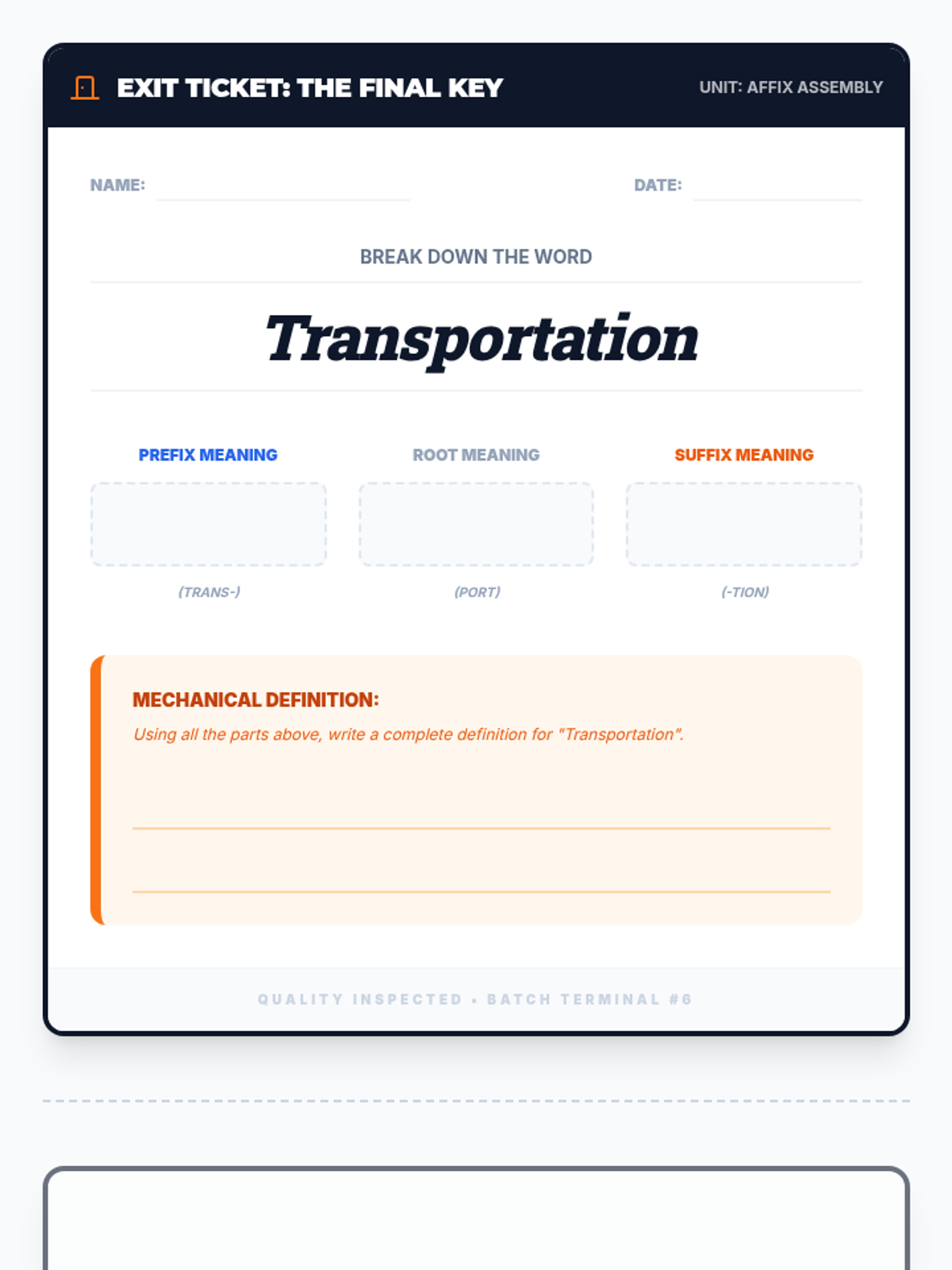 A 6th-grade lesson focusing on deciphering word meanings using affixes (prefixes and suffixes) through the metaphor of a word assembly line. Students will learn to use roots and affixes as 'keys' to unlock complex vocabulary.