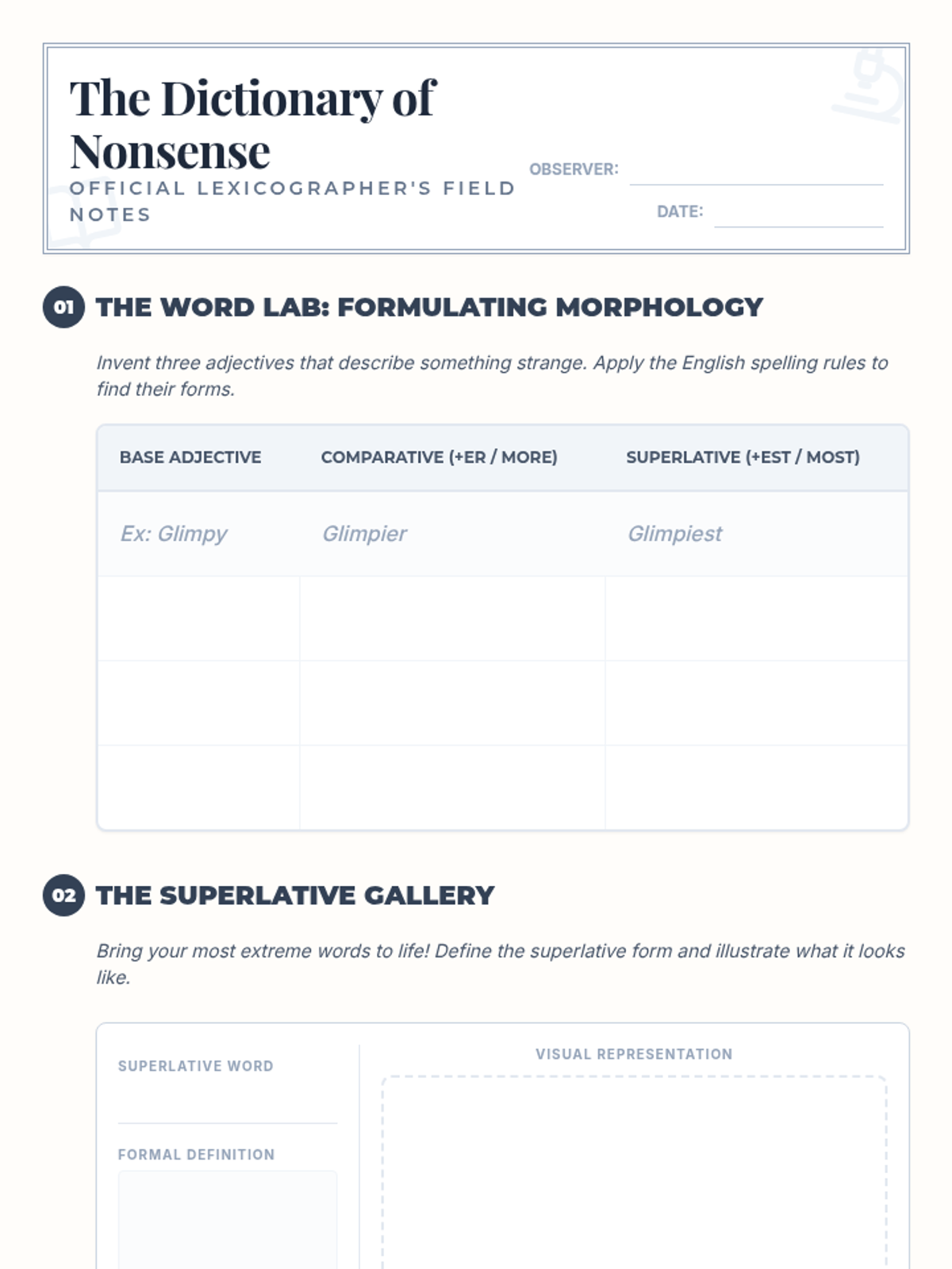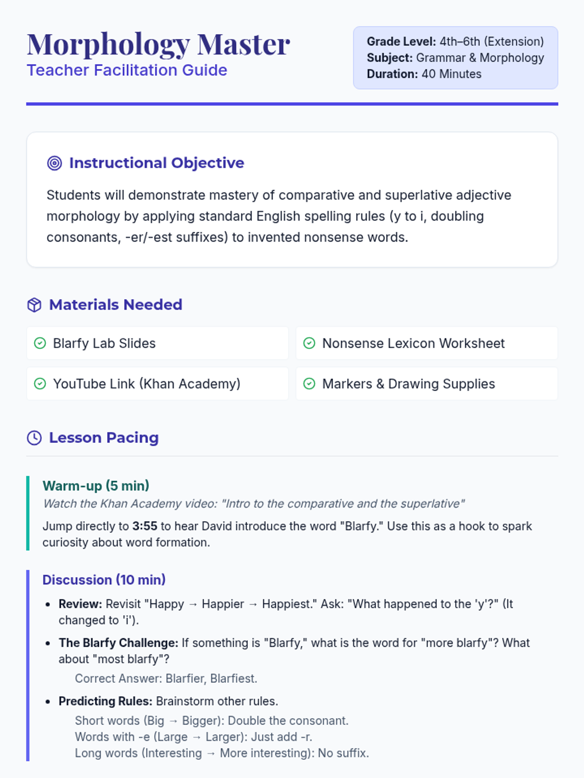 Students explore the morphology of adjectives by applying comparative and superlative rules to invented 'nonsense' words, building on concepts from a Khan Academy grammar video.