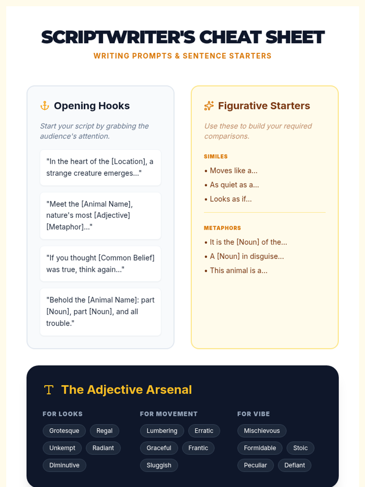 A creative writing lesson for 4th-6th graders where students analyze the humorous and descriptive narration of a nature documentary and write their own 'wildlife scripts' using figurative language.