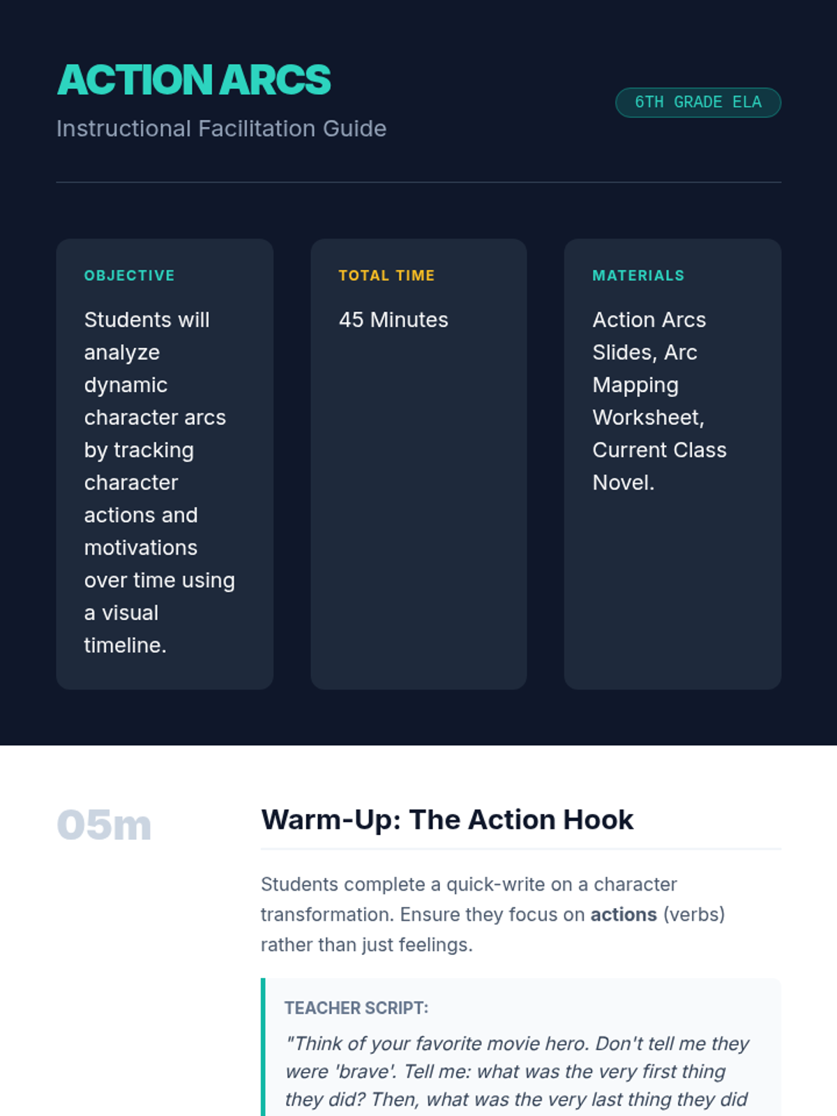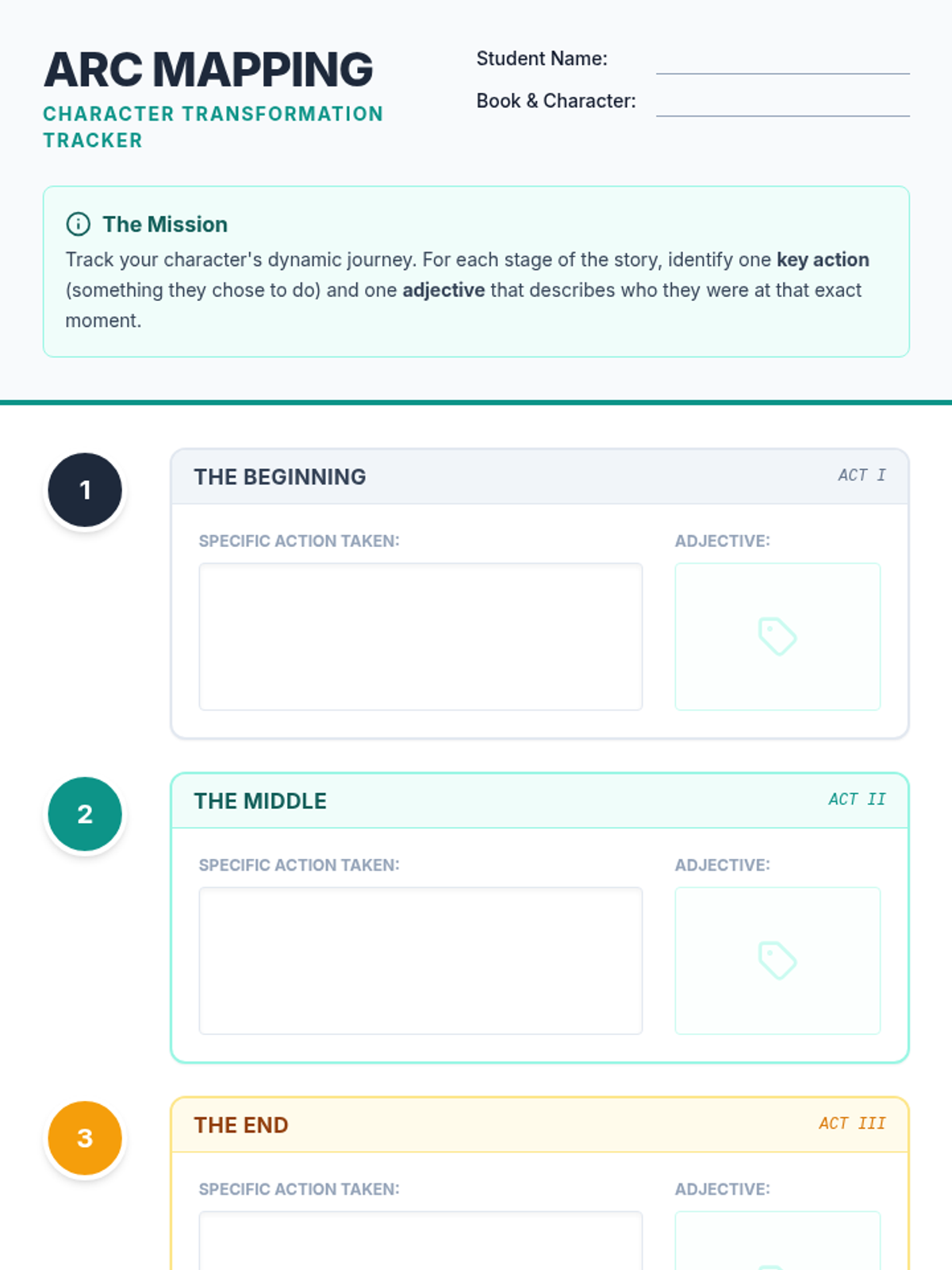 Students will analyze how character actions drive a story and reveal character growth by creating a visual 'Arc Map' timeline based on a class novel.