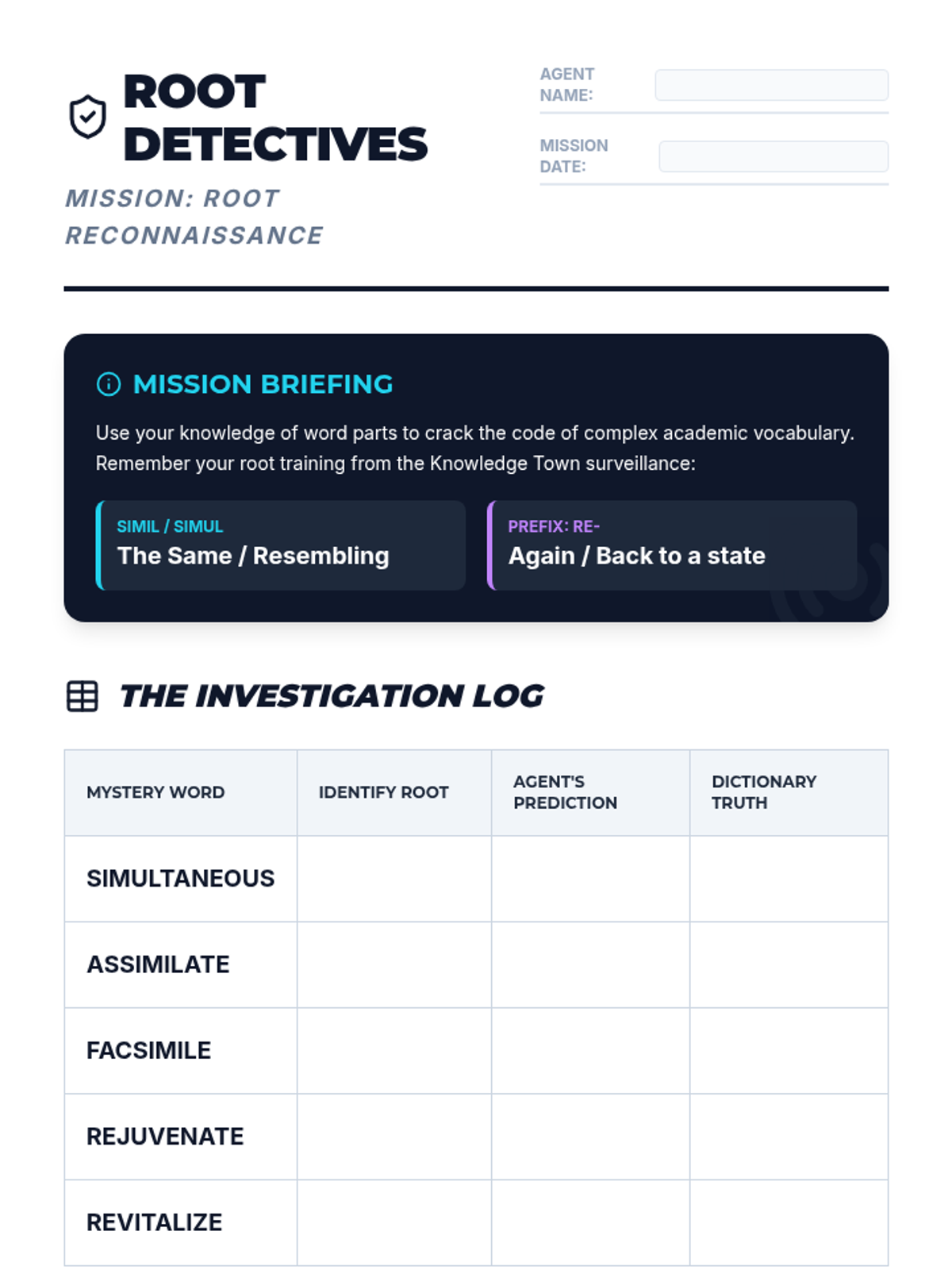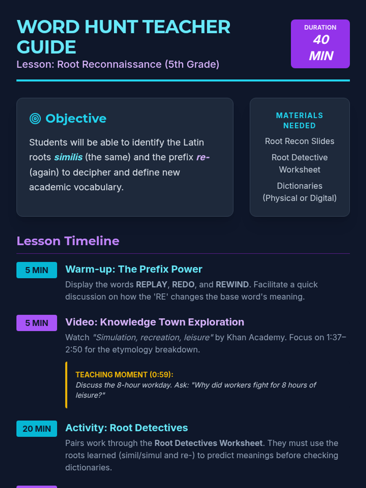 A vocabulary lesson where students explore the Latin roots 'similis' and 're-' through a video-guided investigation to decipher complex words like 'simultaneous' and 'rejuvenate'.
