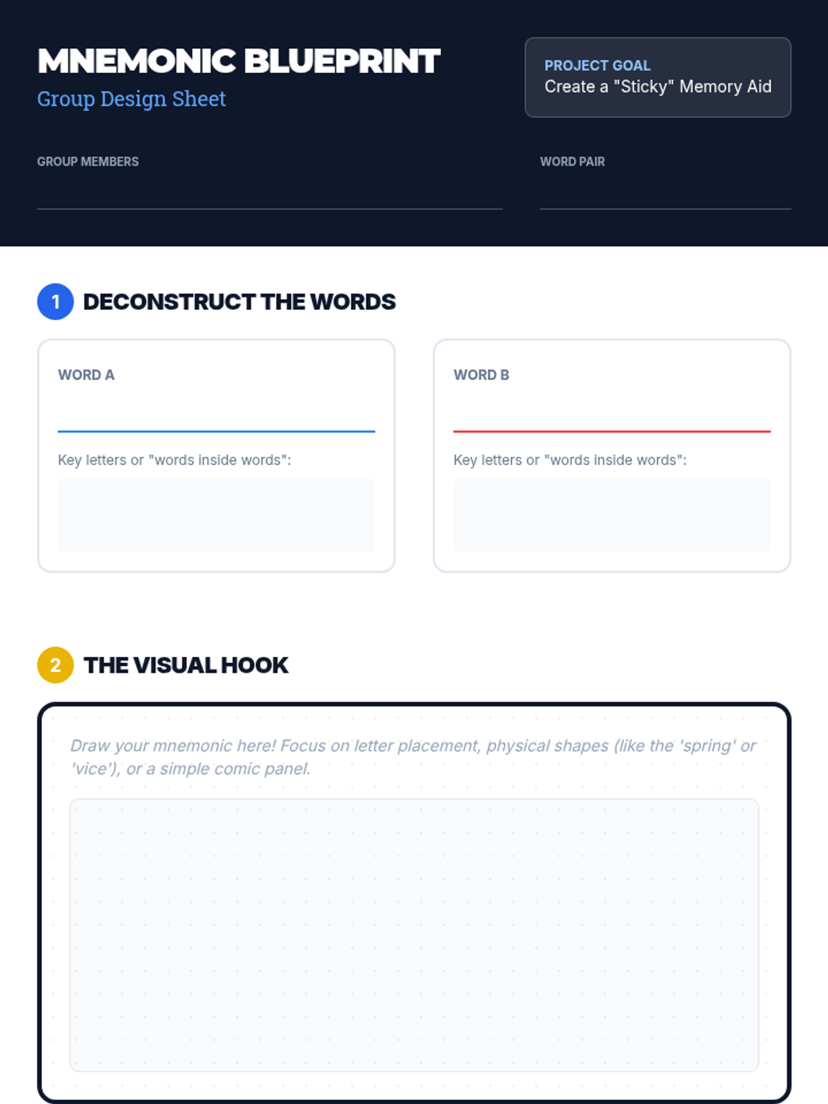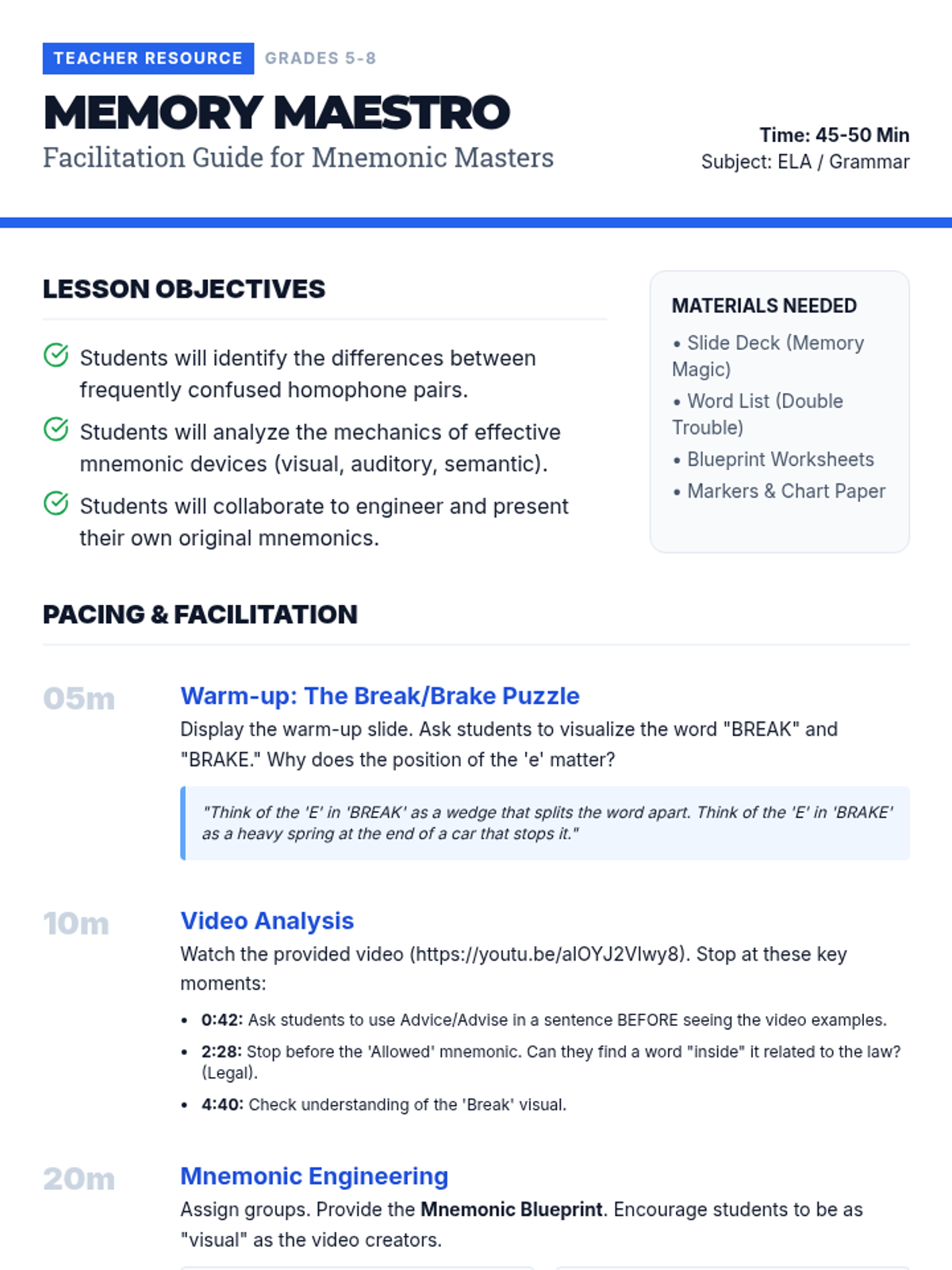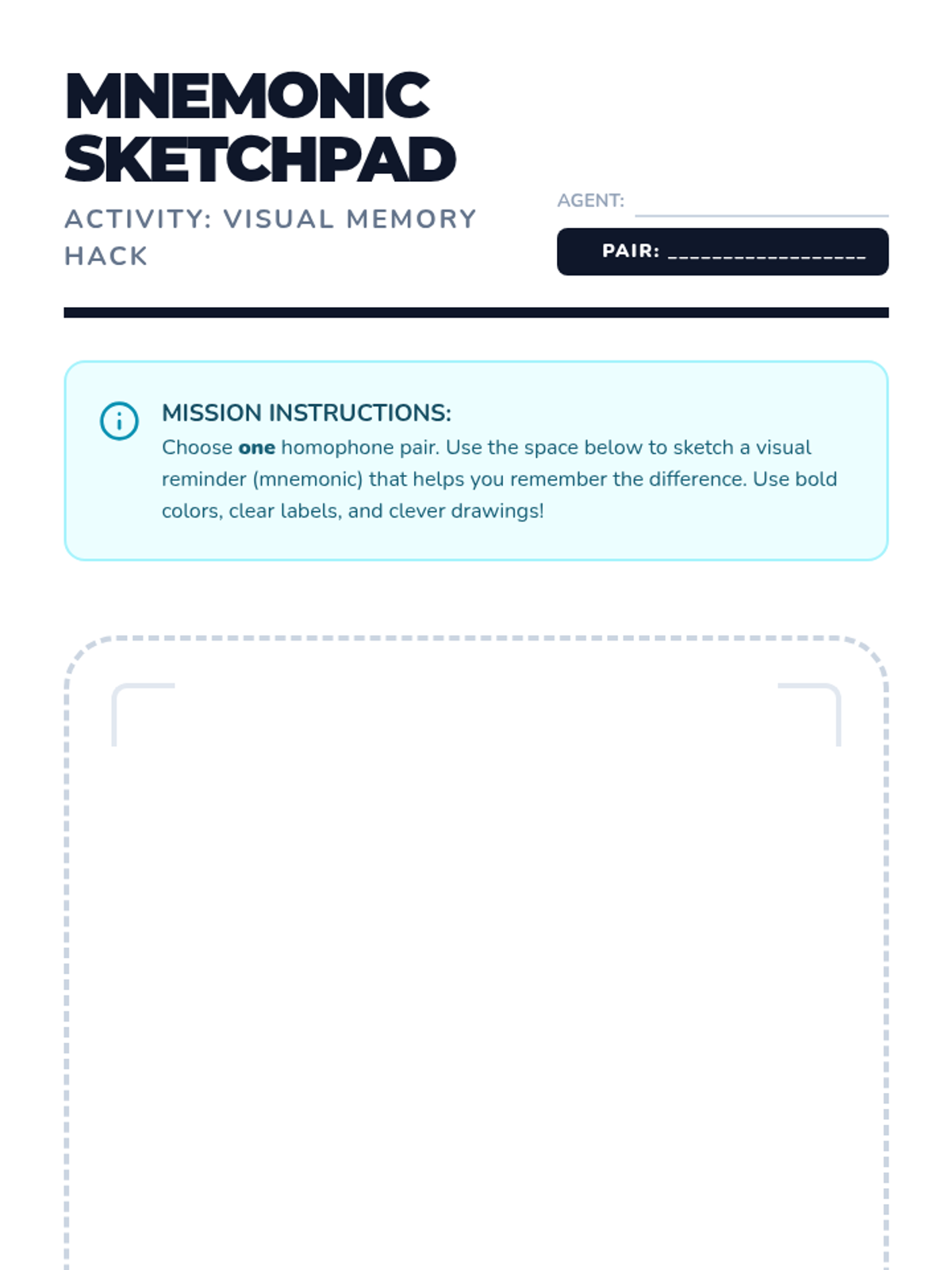 Students will analyze the 'how' behind effective mnemonic devices for confusing homophones and then work in groups to engineer their own visual and rhyming memory aids for a new set of tricky word pairs.