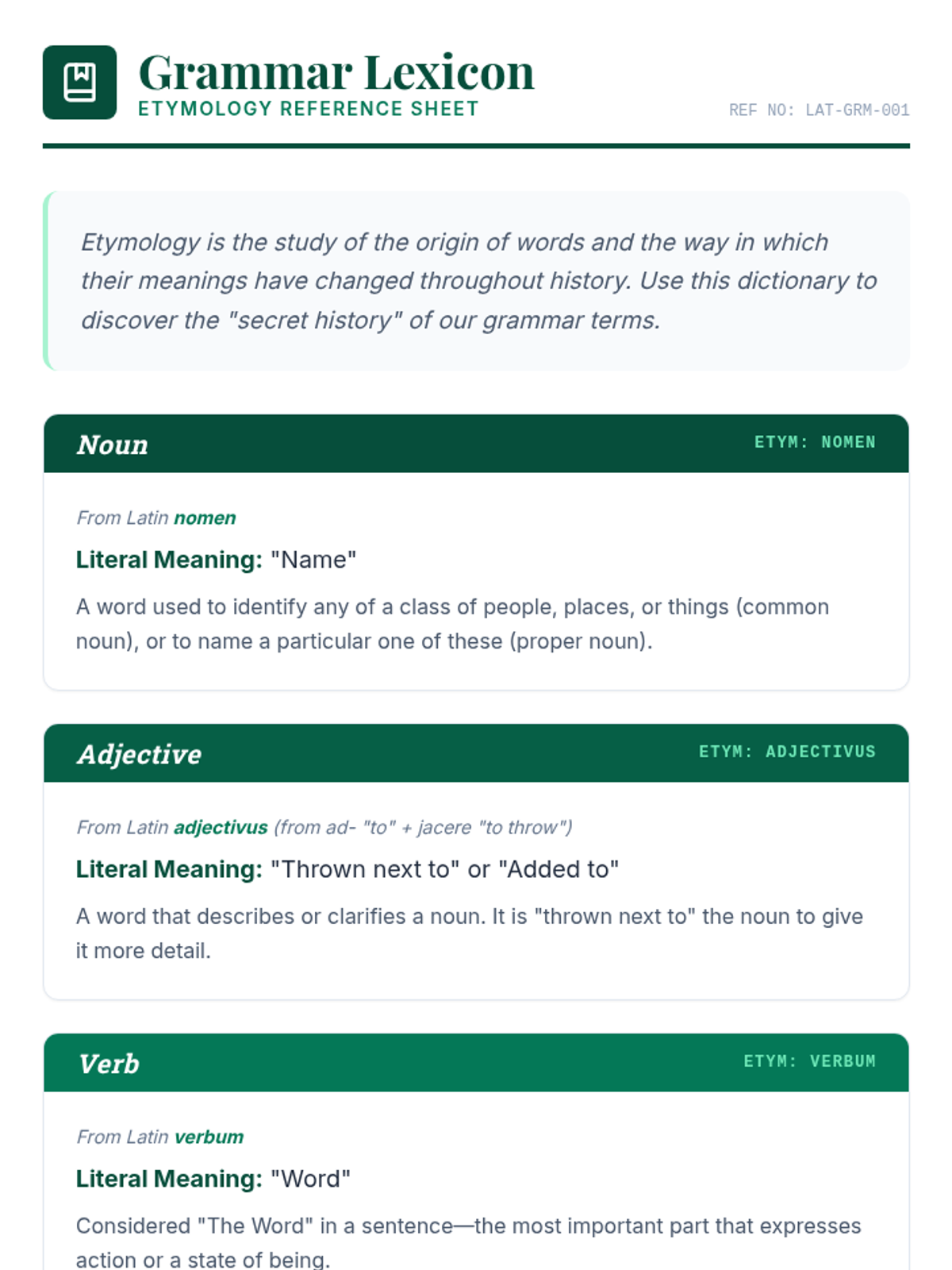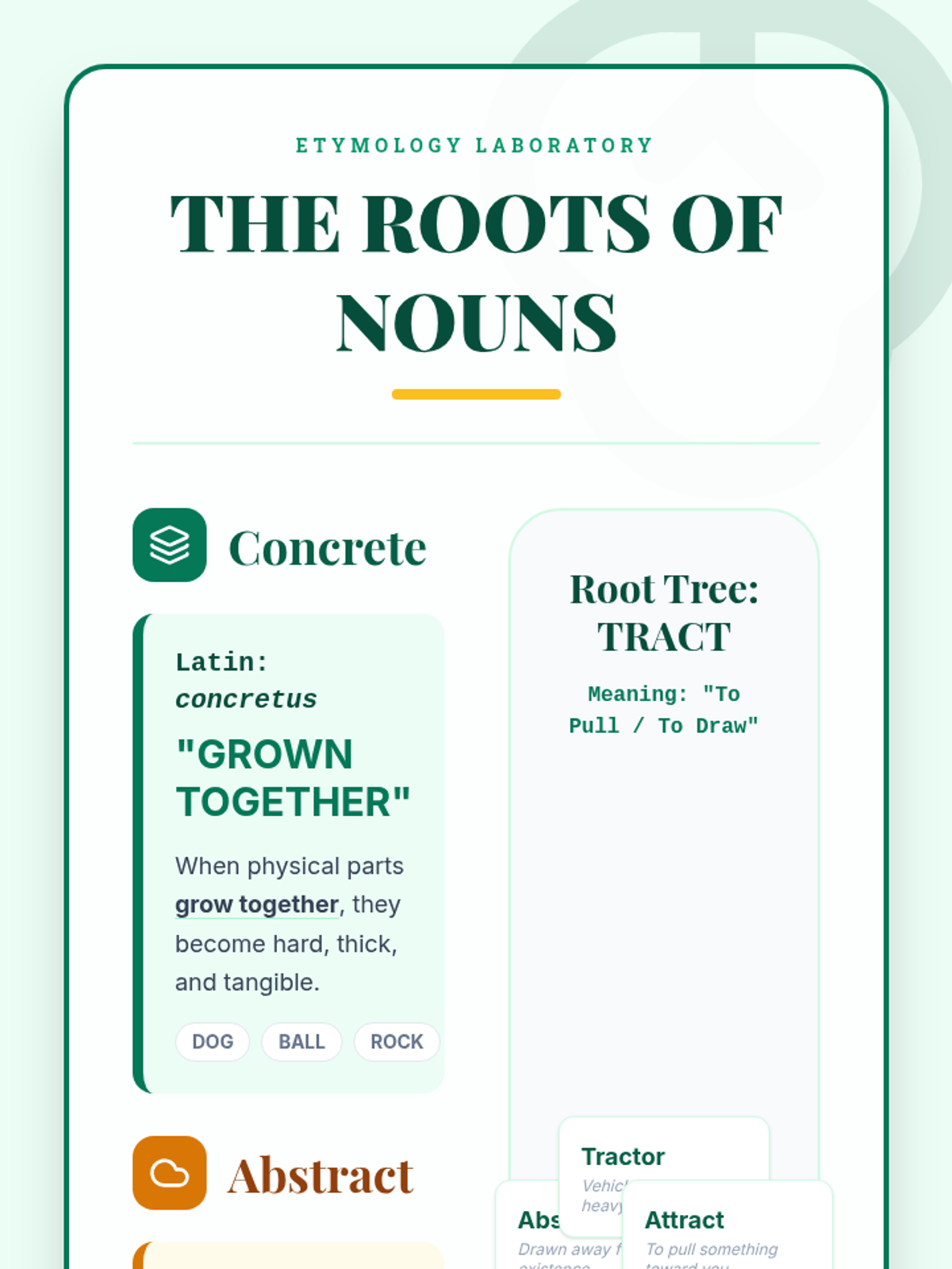 A linguistic exploration lesson where 6th-grade students use etymology (word origins) to master the difference between concrete and abstract nouns, featuring Latin root analysis and root-word trees.