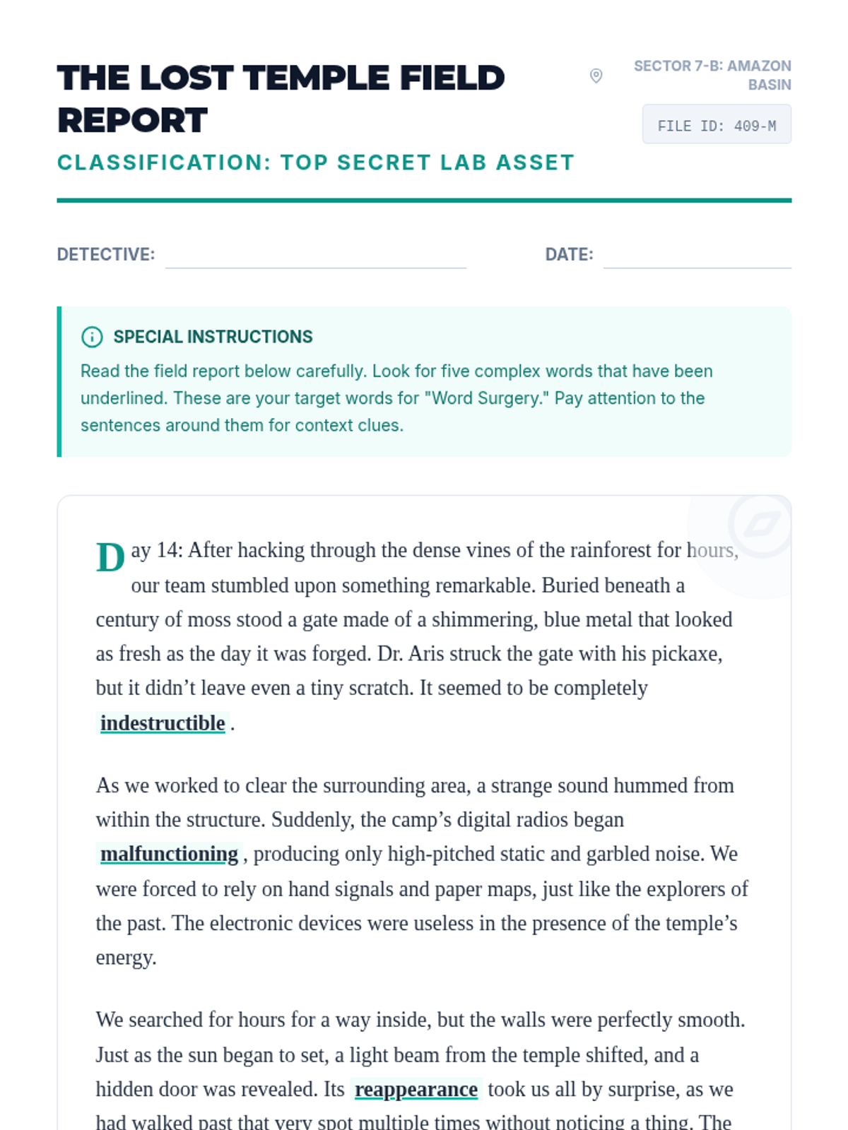 The capstone of the intervention where students integrate all context clue types and focus on selecting the 'strongest' evidence to support complex inferences. Includes a final 'case' to solve.